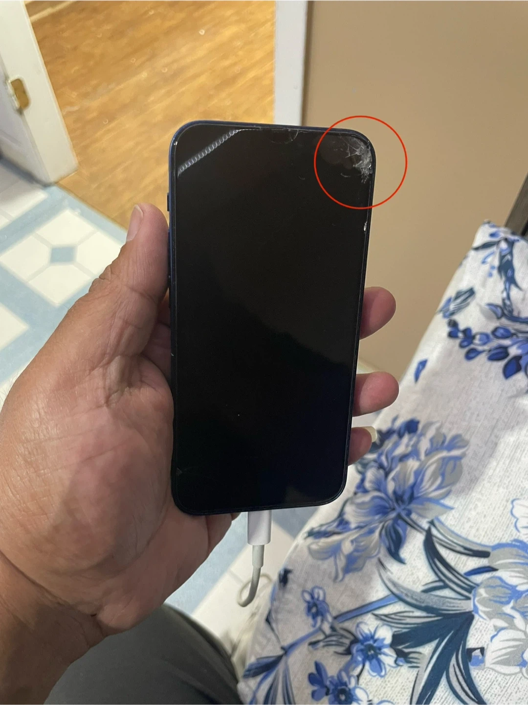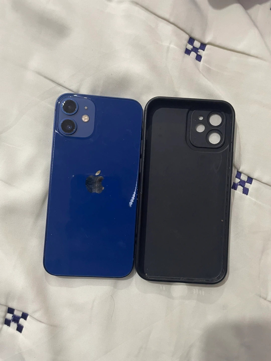 Selling a blue iPhone 12 mini 128 GB. Please note that the screen is not cracked in the upper right corner it’s the screen protector . Comes with a black phone case