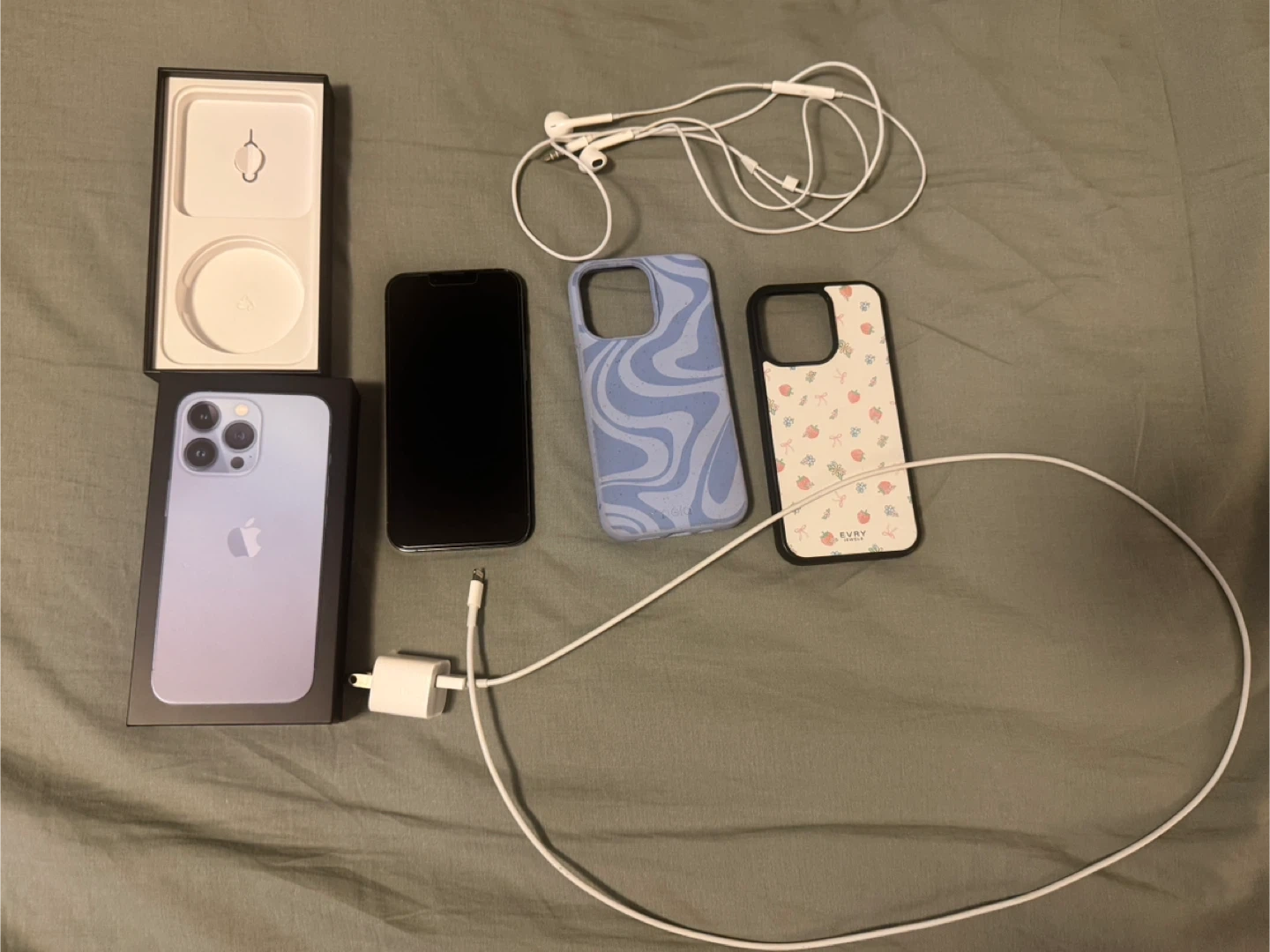 Selling Sierra blue iPhone 13 Pro (128GB, Unlocked) in excellent condition. 79% battery health • Has a screen protector on it already - no scratches or damage • Comes with 2 cases, apple charger cube + cord, wired headphones and original phone box - Additional 10ft nylon braided charging cord included (not pictured) - MagSafe case (one Pela brand) • Fully factory reset and ready for a new owner now. Quick responses, serious buyers only. Pickup only.