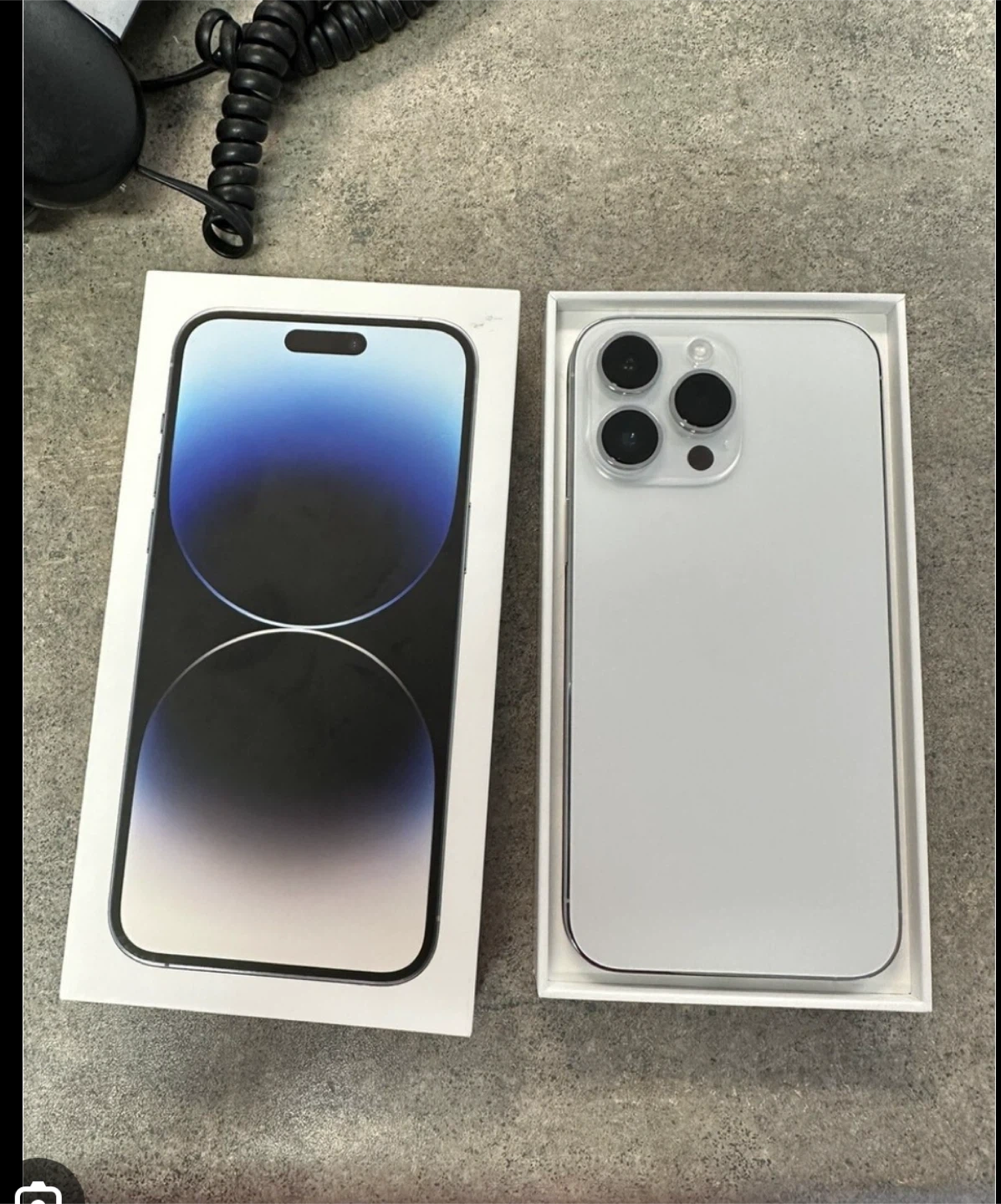 Selling a used iPhone 14 Pro max in silver! It comes with the box and a charger . Battery life is 86 % . Phone was purchase 2023 and it is in prestine condition. No cracked and no damaged. All parts are original . Meet up place is STC mall . No shipping and No delievery . Cash only
