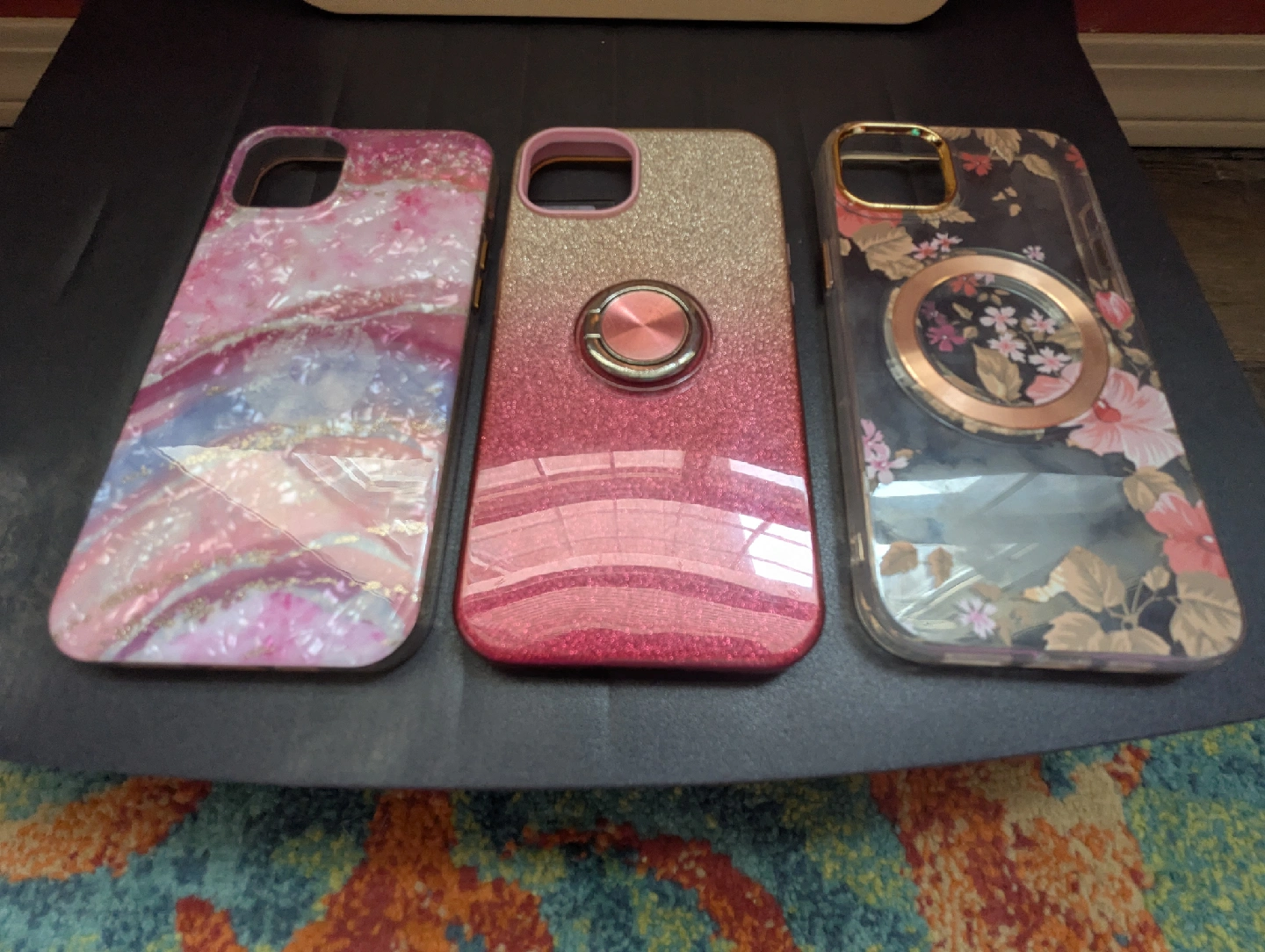 Selling three used iPhone cases, each with a built-in PopSocket! They are in good condition and ready for a new home. The cases feature different designs: a pink marble pattern, a pink glitter gradient, and a floral design.