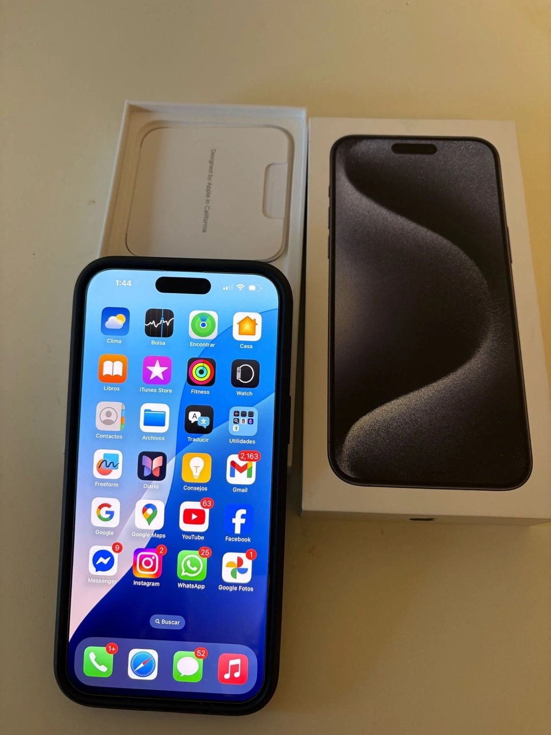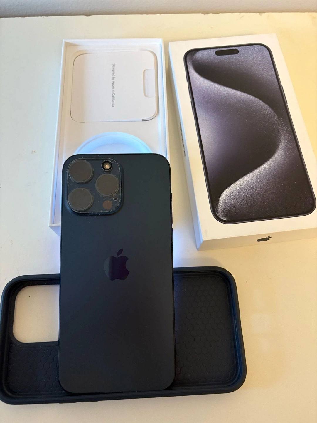 42Pre-owned iPhone 15 Pro Max in black. Includes original box and case. Phone shows minimal wear.