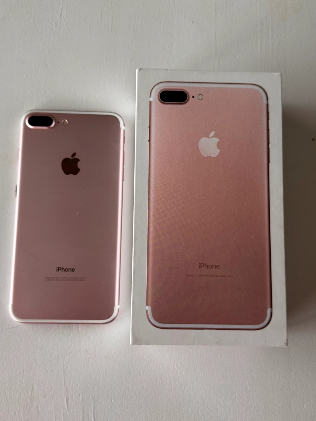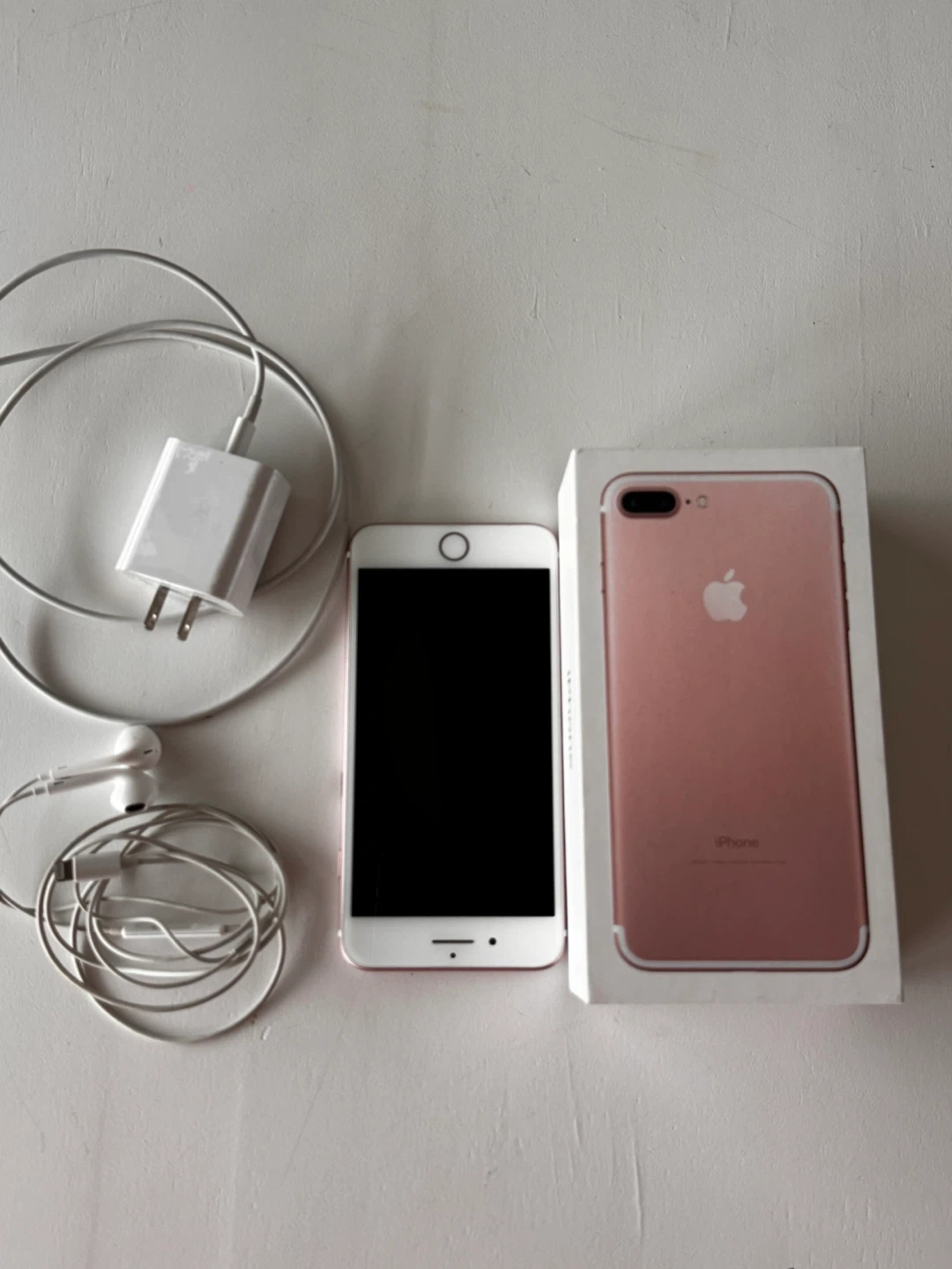 0iPhone 7 Plus in rose gold. It comes with the original box, charger, and headphones. It's in good condition and ready for a new owner
