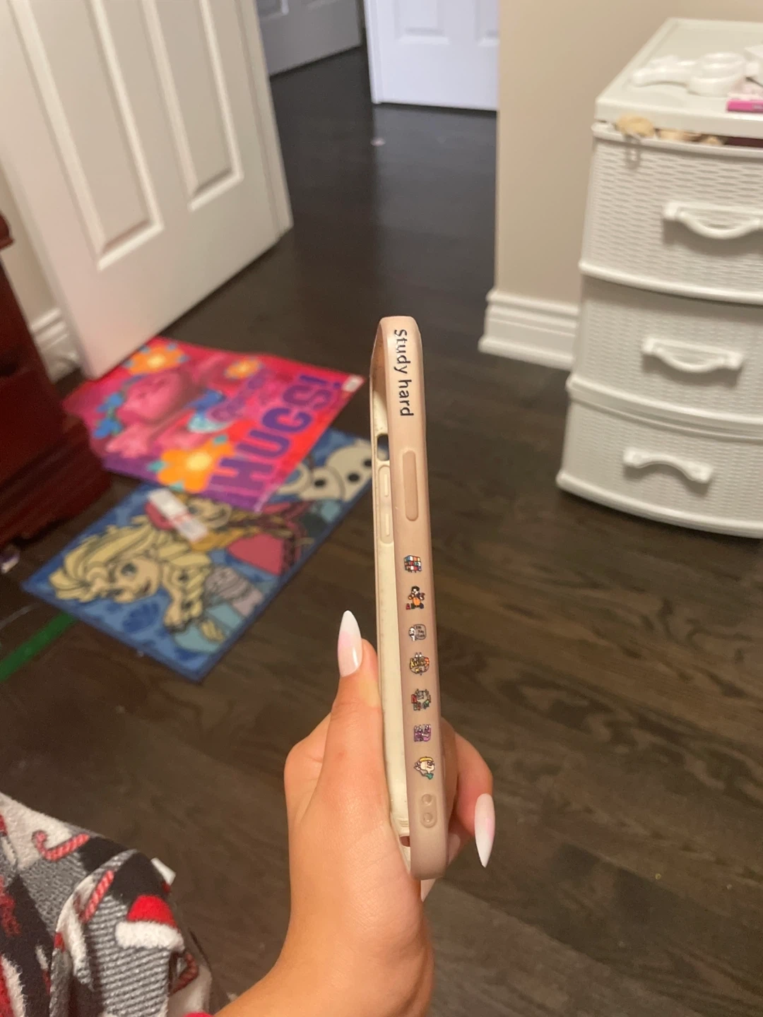 15Selling a used iPhone case. It has a 'Study Hard' design on the side and a Rubik's cube design on the back. It's in fair condition with some signs of use