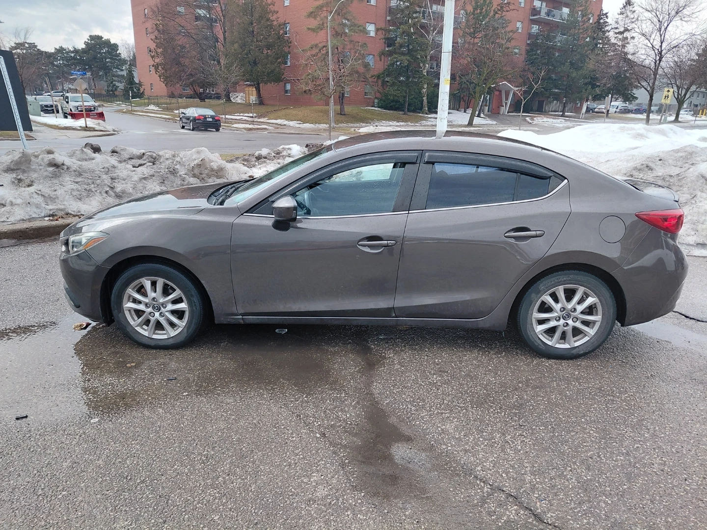 This is a metalic brown Mazda 3 sedan. It's a four-door car with tinted windows. The car has alloy wheels and a rear spoiler. It's a dependable ride for daily commuting.