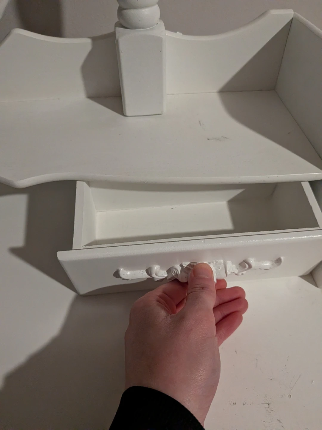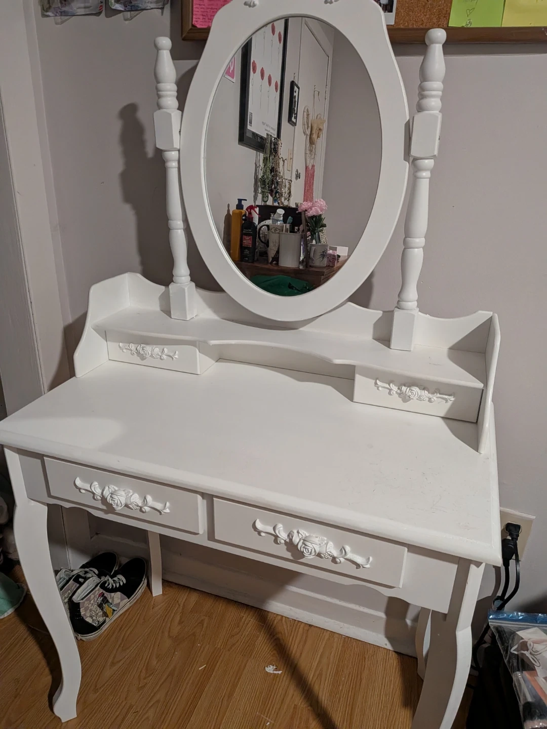 A classic white vanity desk with an oval mirror. It features several drawers for storage, including two larger ones at the front with decorative rose carvings. The top surface has two smaller compartments with ornate handles. It's perfect for a bedroom or dressing area.