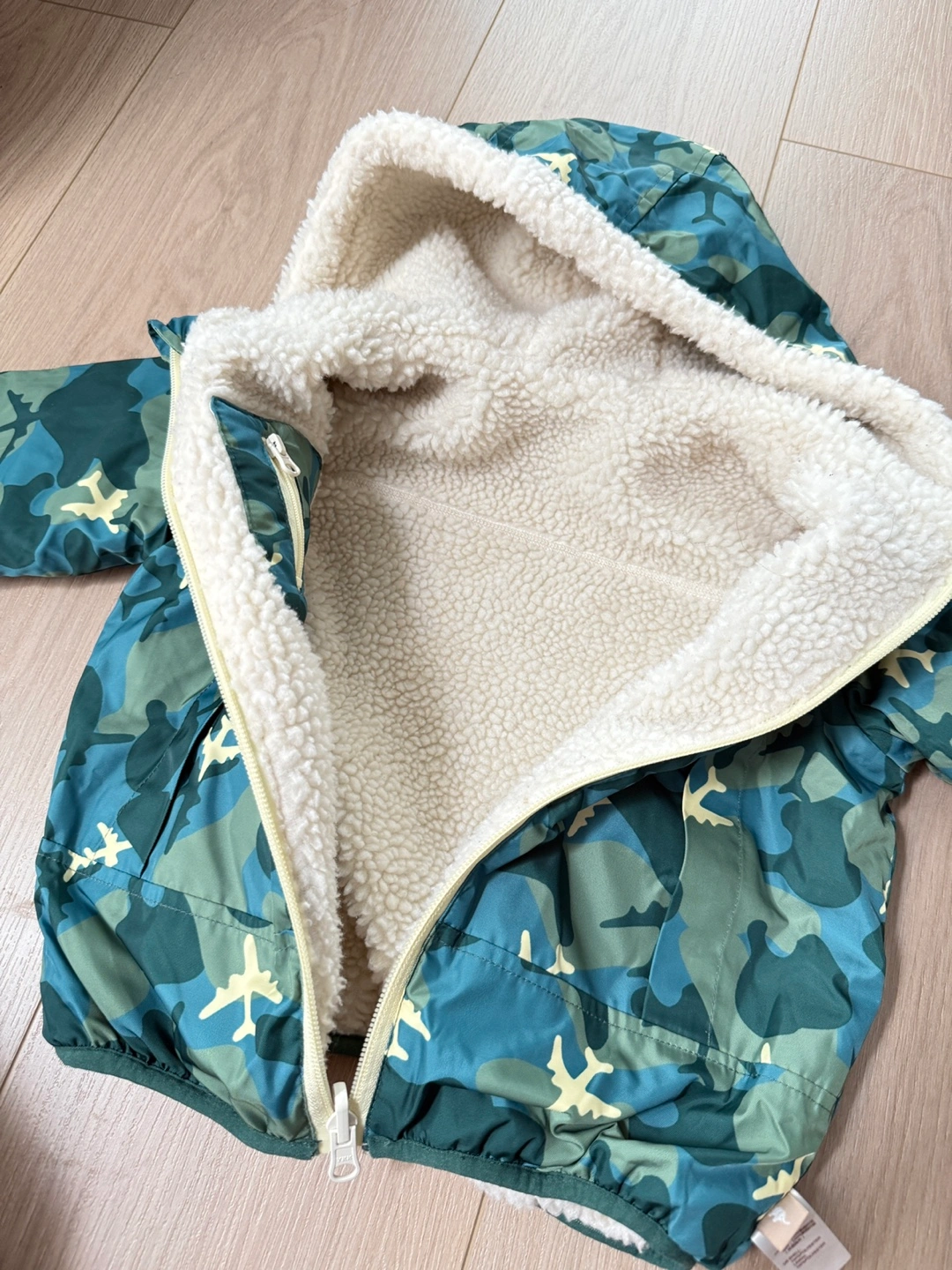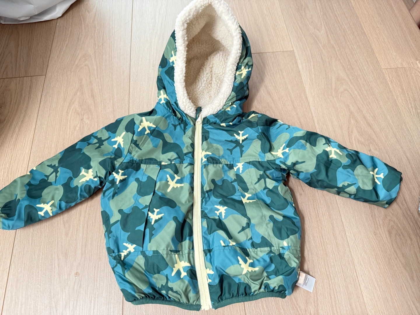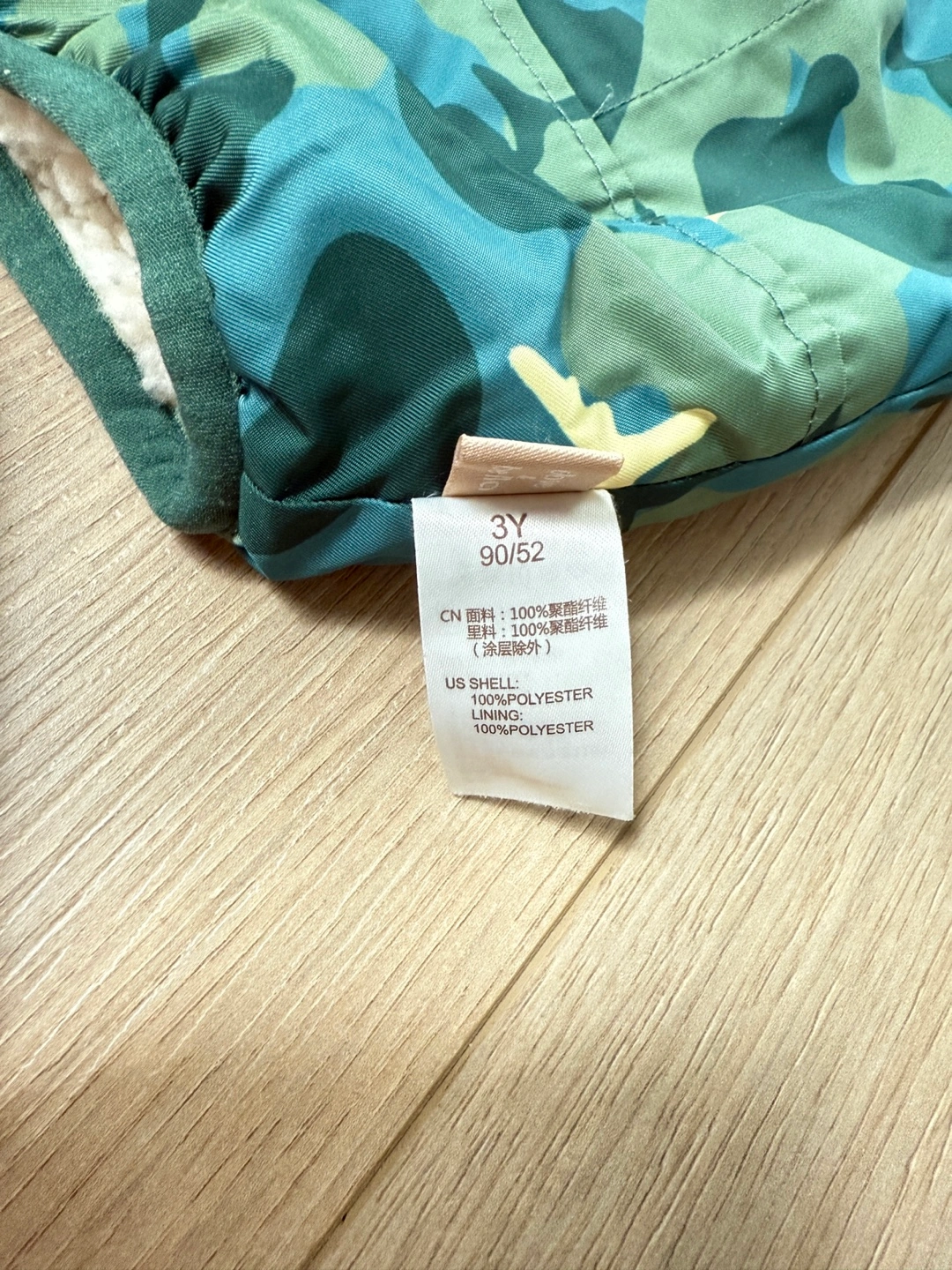 This cute camouflage padded jacket is perfect for keeping your little one warm! It features a soft, cozy lining and a fun airplane pattern. Size 3Y. Shell and lining are 100% polyester