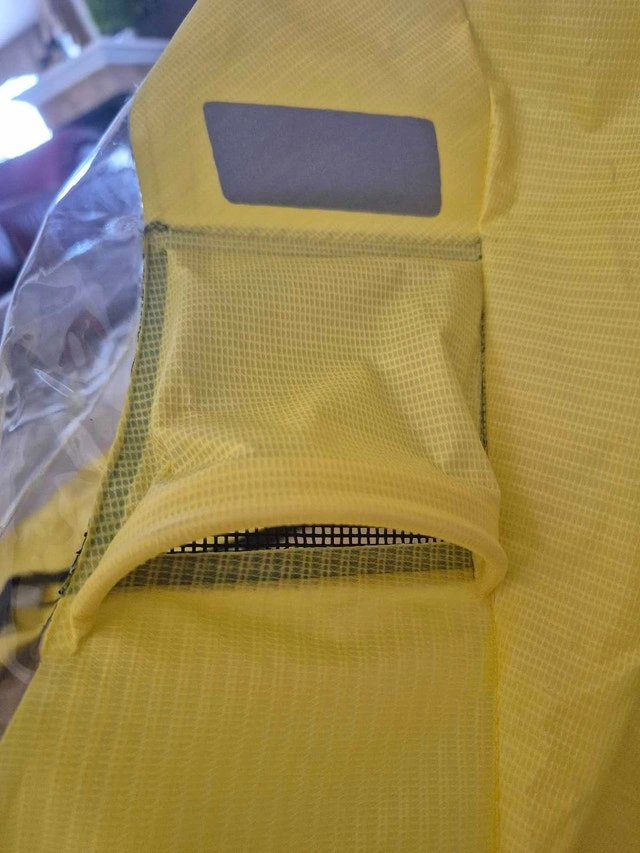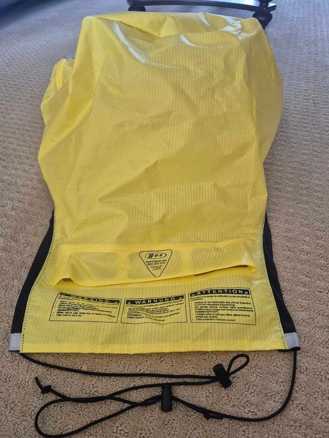 This bright yellow Bob jogging stroller rain cover has reflective stripes for good visibility day or night.