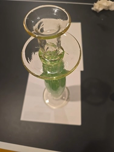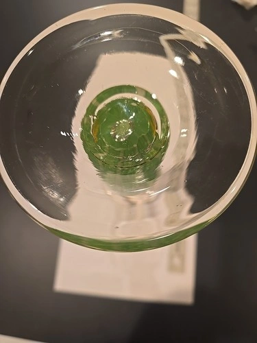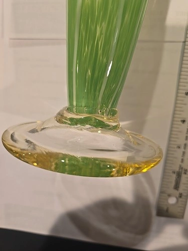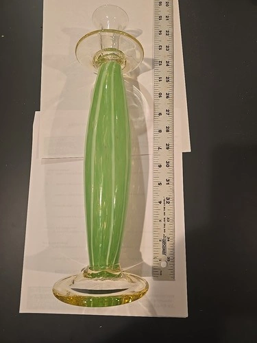 This Green White Twist Murano Style Hand Blown Art Glass Candleholder is a stunning piece of decorative collectible, perfect for all occasions. Standing at 14 inches tall, this medium-sized candle holder features a beautiful swirl pattern in green glass, with a glossy finish. Hand-blown using art deco style, this original piece exudes an artistic and elegant charm that will enhance any room's ambiance. Made of high-quality glass, this candle holder is sure to be a standout addition to your decor collection.