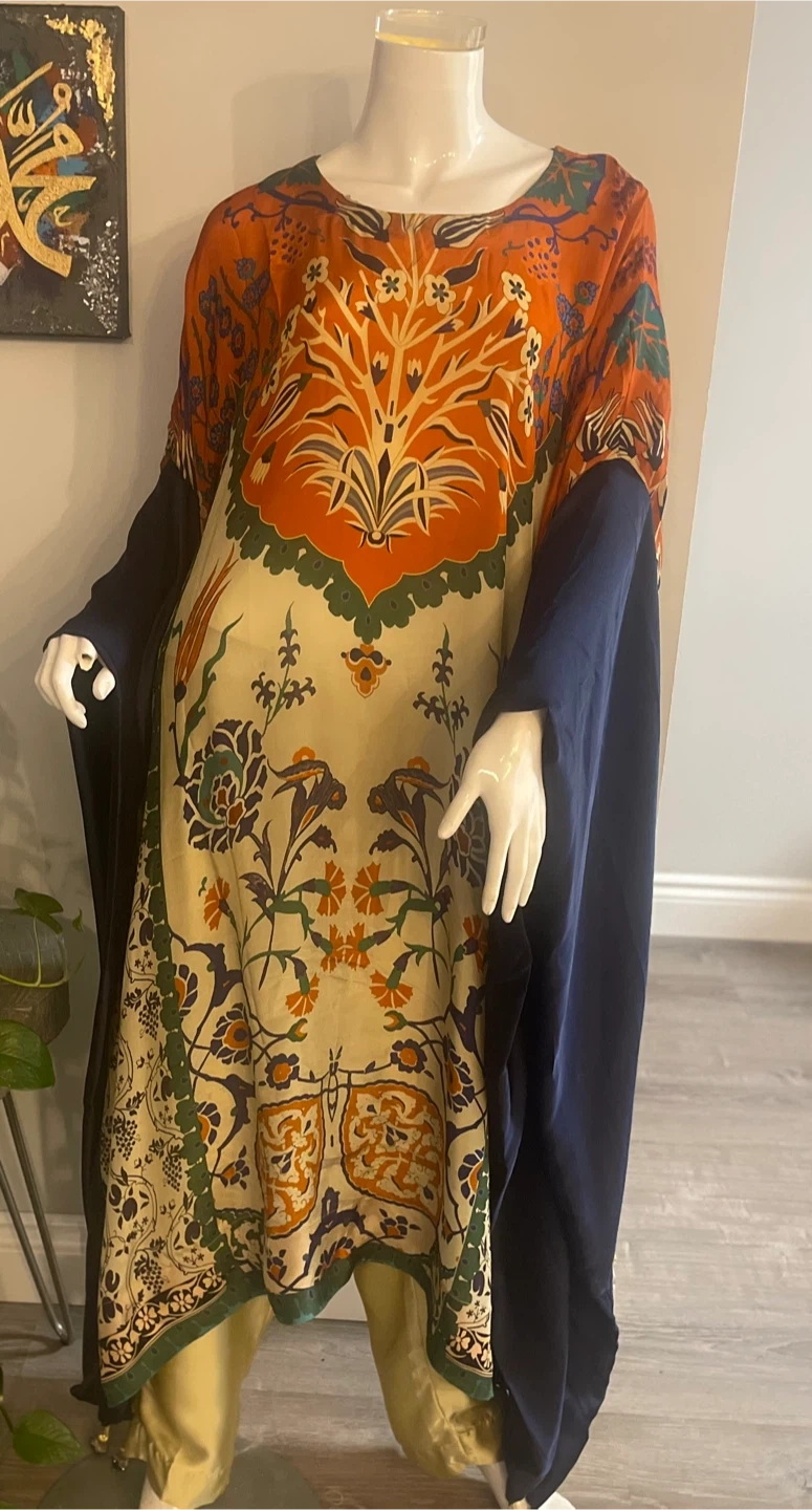 Orange Floral Print silk Kaftan with Navy Sleeves