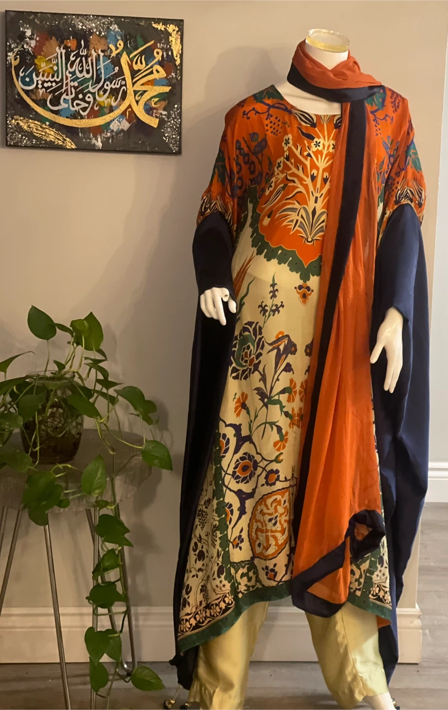 This kaftan features a vibrant orange print with floral and nature motifs on a cream background. It has contrasting navy blue bell sleeves and a matching navy trim. It includes a coordinating scarf. This garment is suitable for festive occasions or stylish casual wear.