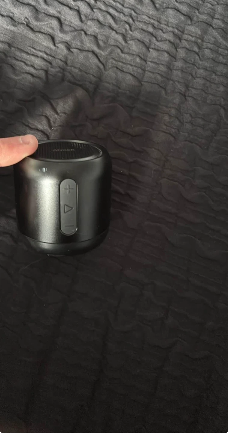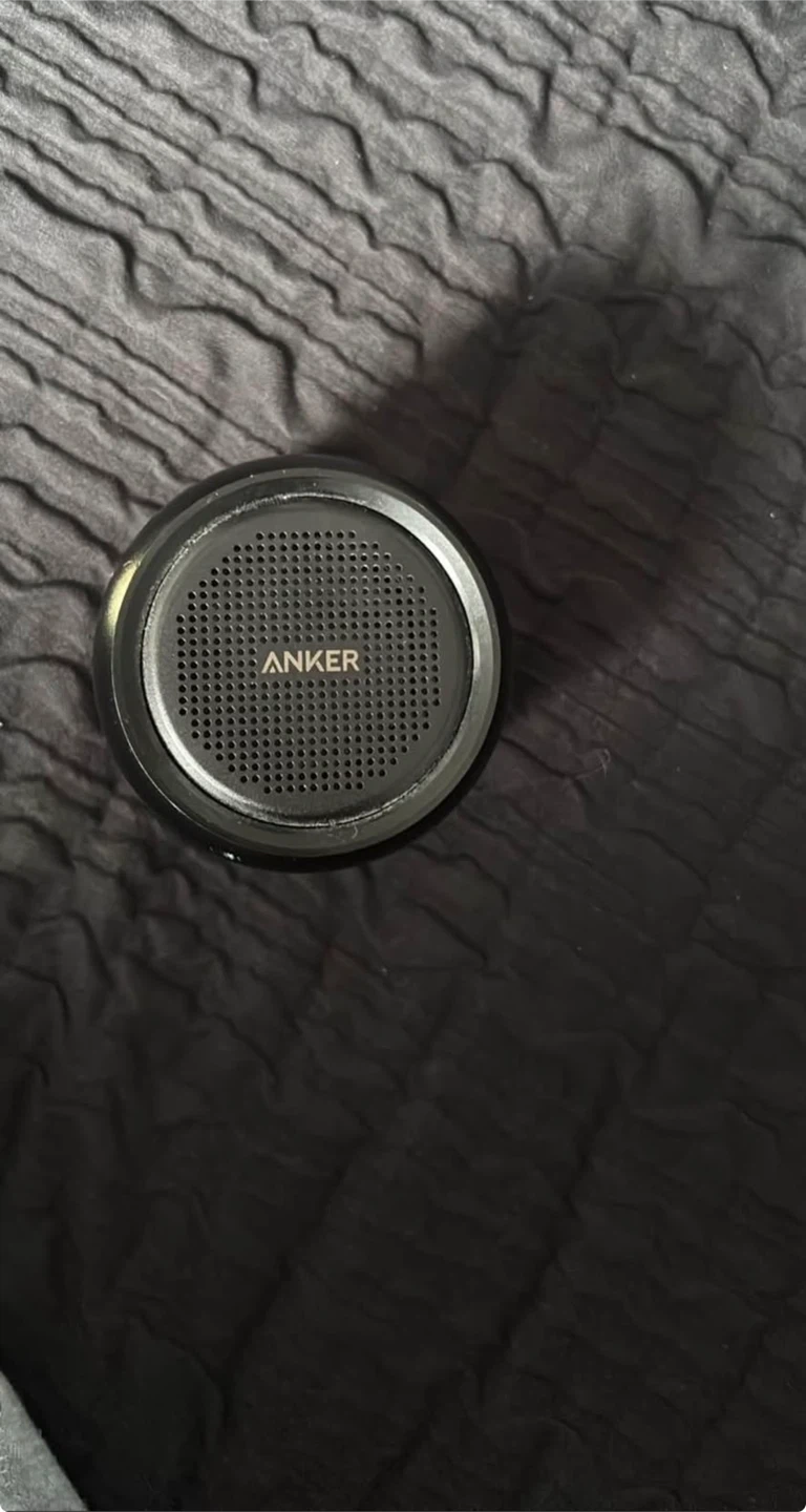 Anker portable Bluetooth speaker in black. It's a compact and durable device for on-the-go audio. Volume controls are on the side.