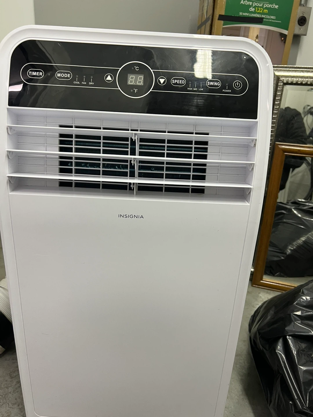 This Insignia portable air conditioner offers 12000 BTU cooling capacity. It's designed for efficient cooling and includes a hose for exhaust. The unit has a digital display for temperature and mode selection. No hose no remote control.