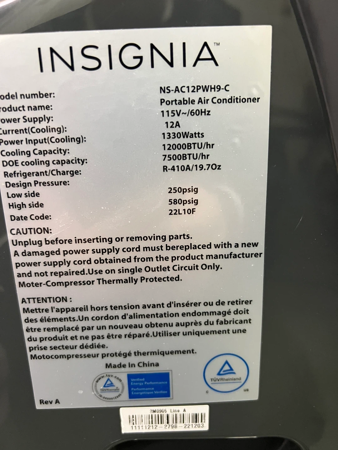 Insignia Portable Air Conditioner NS-AC12PWH9-C 12000 BTU