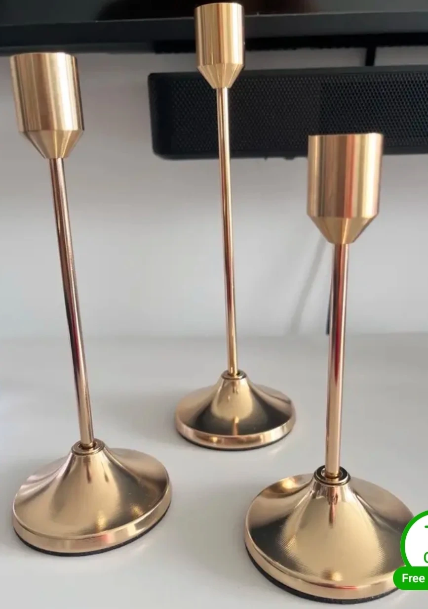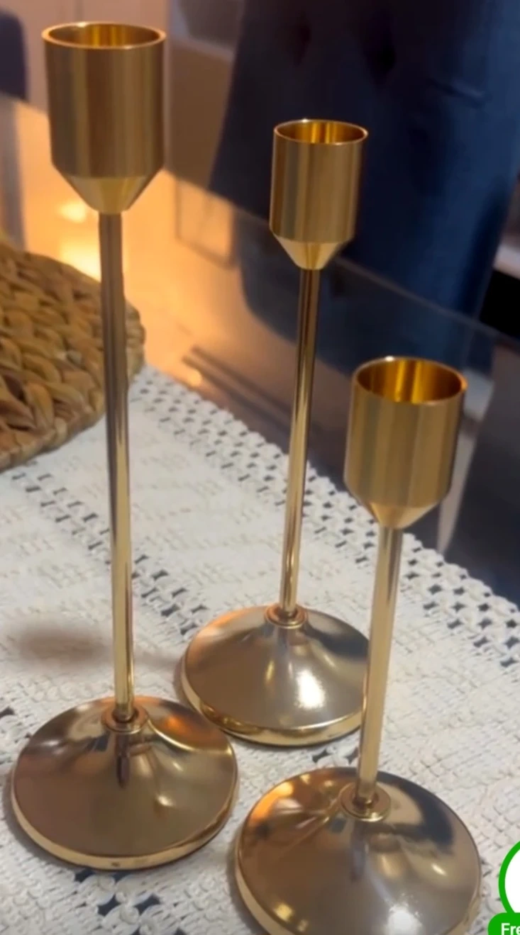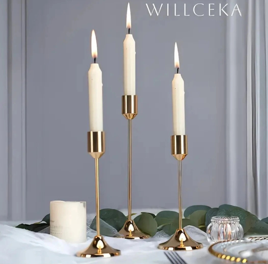 Three elegant gold metal candlestick holders by WILLCEKA. Metal construction provides durability. Add a touch of sophistication to your dining table or mantlepiece. Perfect for creating ambiance during dinner parties or quiet evenings at home!