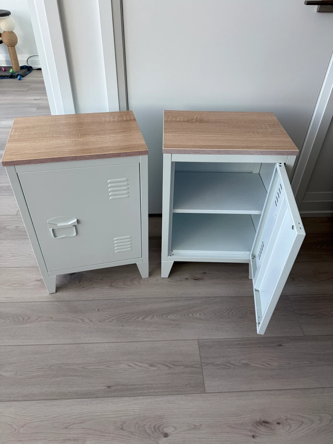 Selling a pair of cute locker-style nightstands! They're off white metal with a light wood-look top. One has the door open to show the shelf inside. Perfect for a bedside or small space! Like - immaculate.