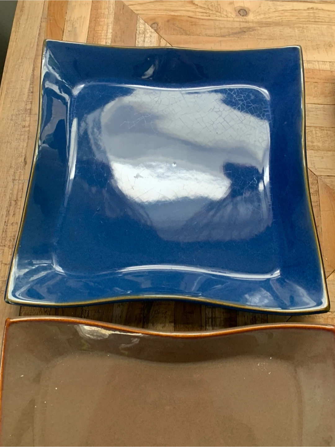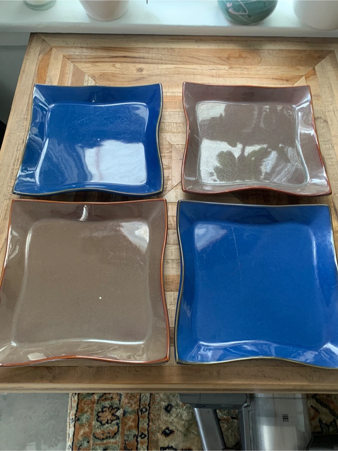 These four square plates come in a mix of blue and brown colours. They feature a unique wavy edge design. Great for serving meals.
