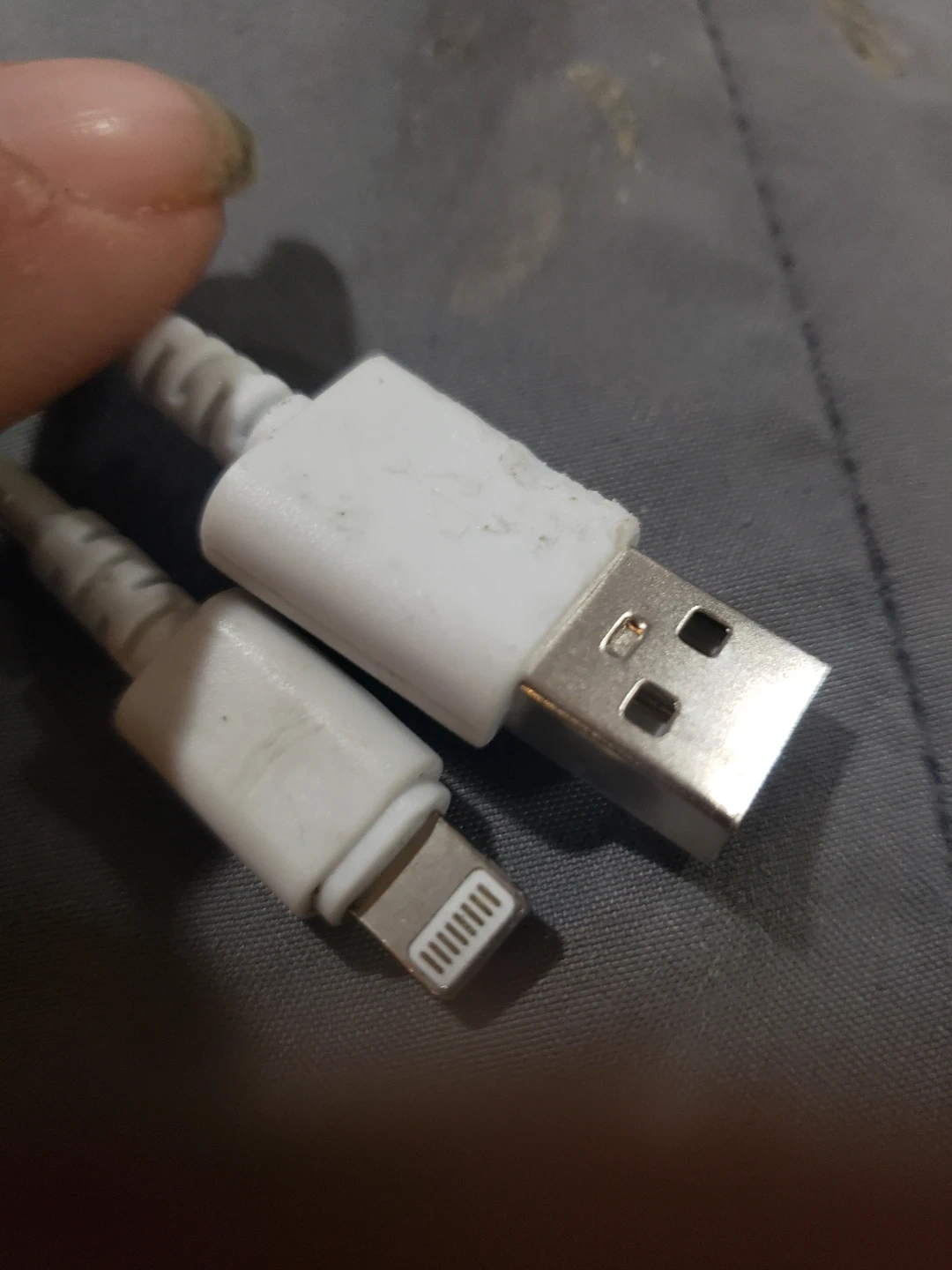 This is a white charging cable with a Lightning connector on one end and a USB-A connector on the other. It's used for charging Apple devices. Cable is white and 10 feet long.