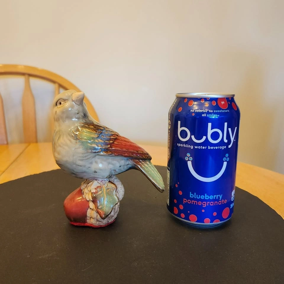 Brightly colored with greens, blue and red accents, this ceramic bird perched on an acorn will be a great addition to your home decor.