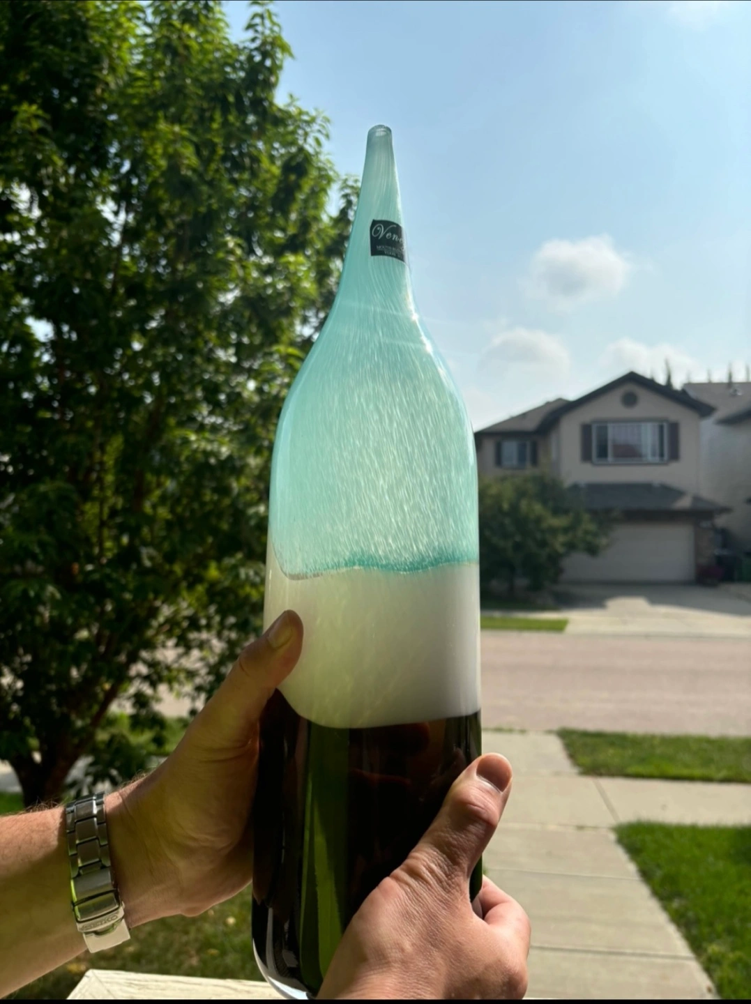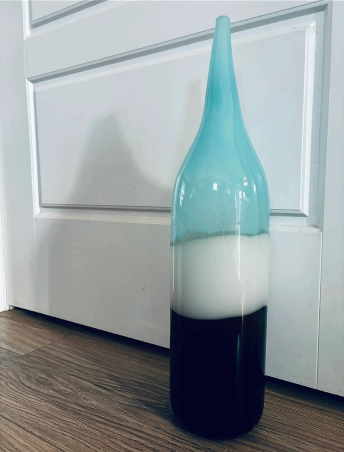 Mouth-blown glass vase with a turquoise, white and black design, stands 20” tall. Perfect condition. Has mouth-blown glass quality sticker in tact.
