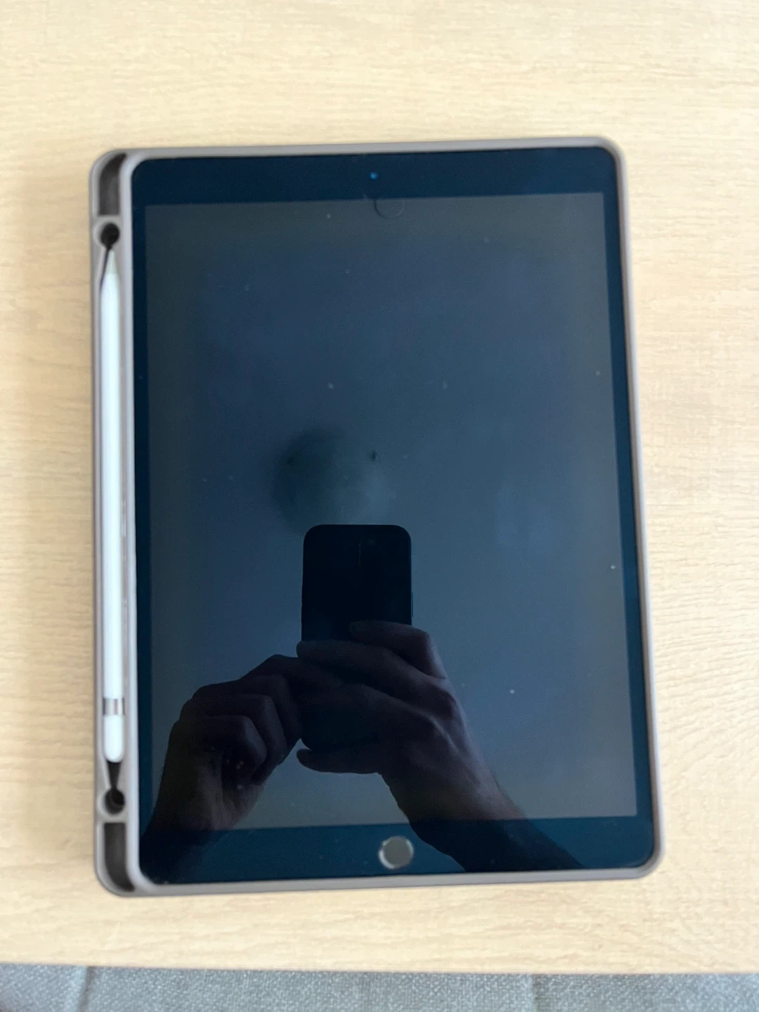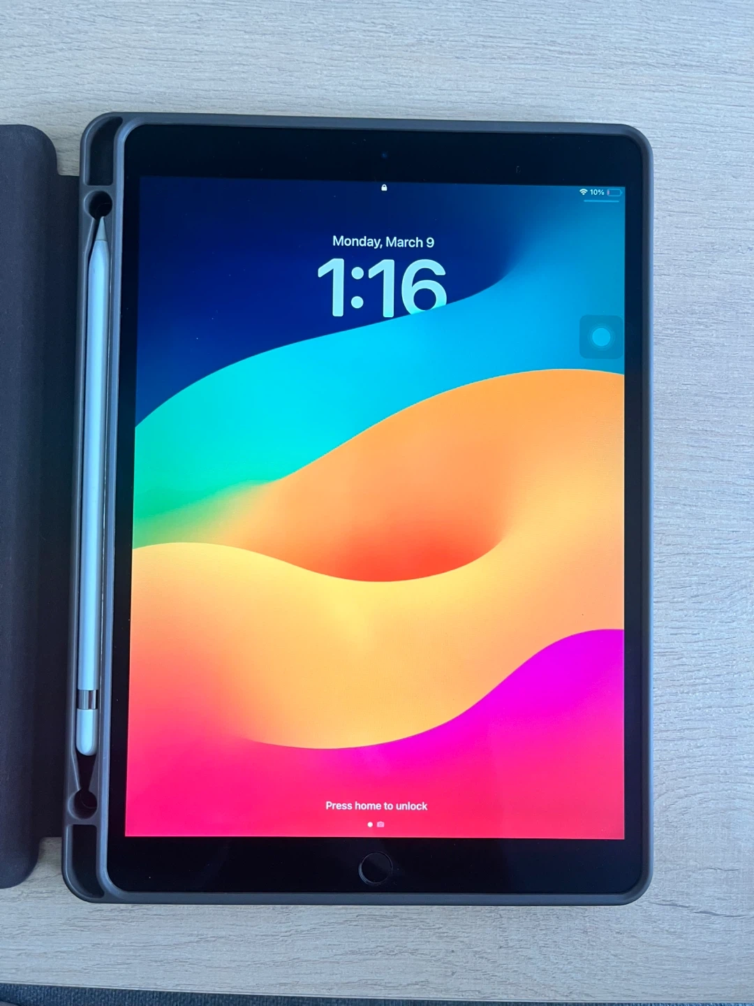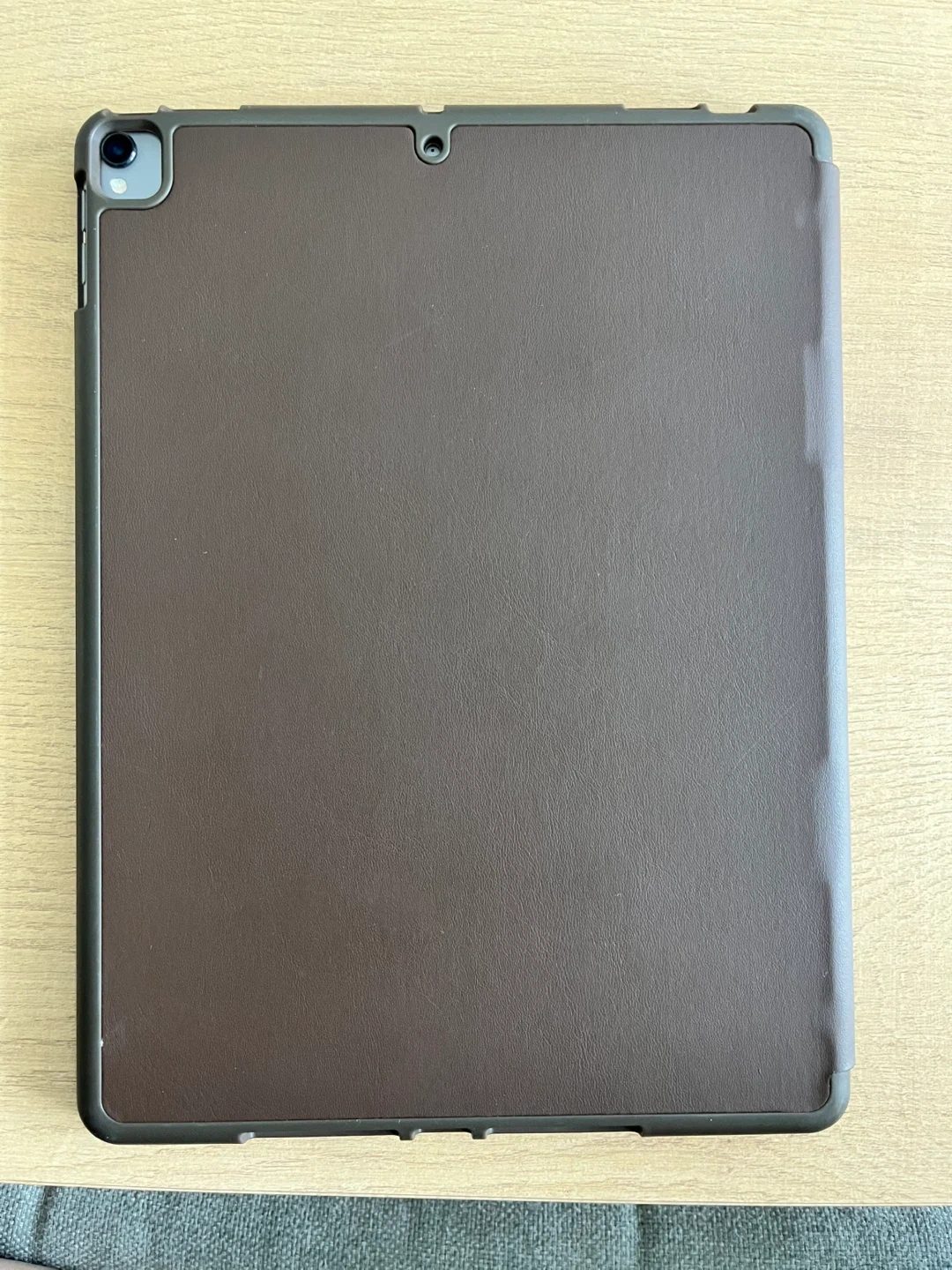 It also comes with an Apple Pencil (1st generation) and a cover. This is a brown folio case. It's made from a leather-like material. The case offers protection and a stand function. It also has a spot for an Apple Pencil.