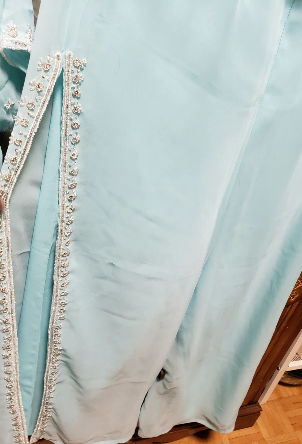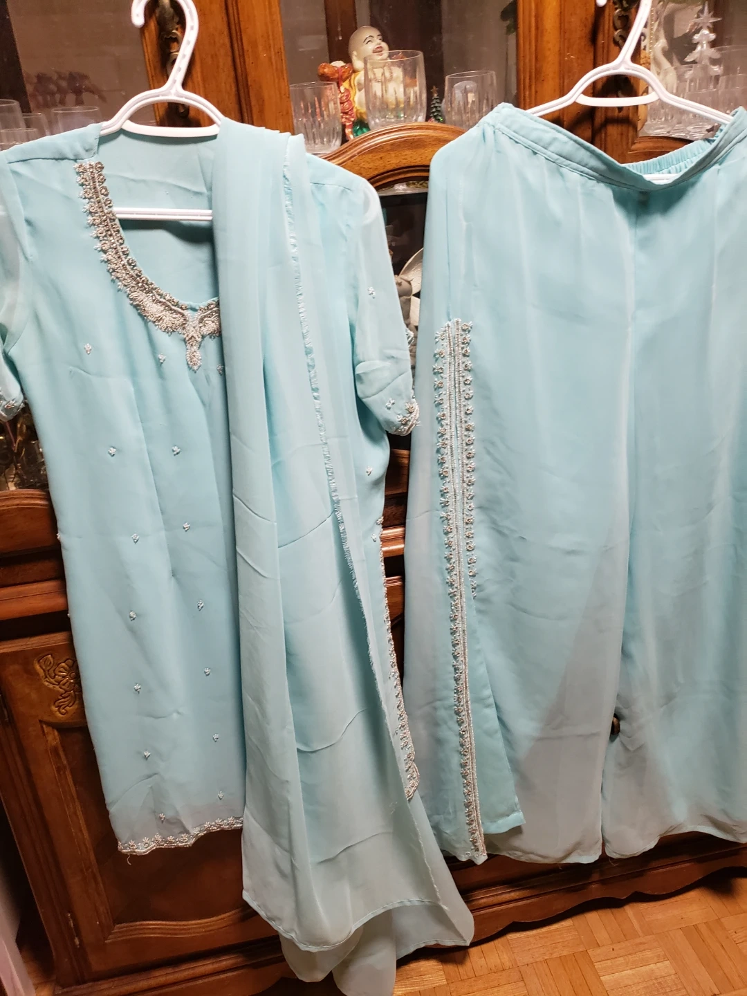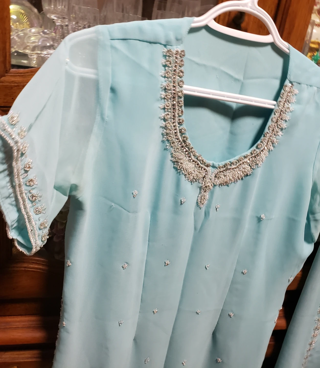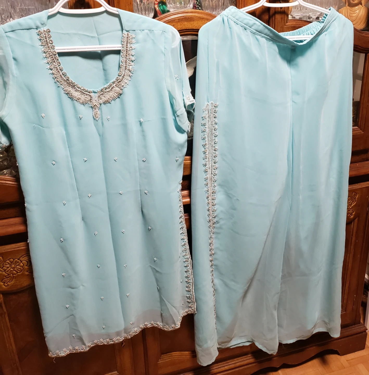 Used only once. Medium size. This is a two-piece outfit featuring a light blue kameez and matching pants. The neckline and sleeves of the kameez are adorned with intricate silver bead and sequin embellishments. The pants also have decorative trim along the side seams. It's made of a sheer, lightweight fabric.