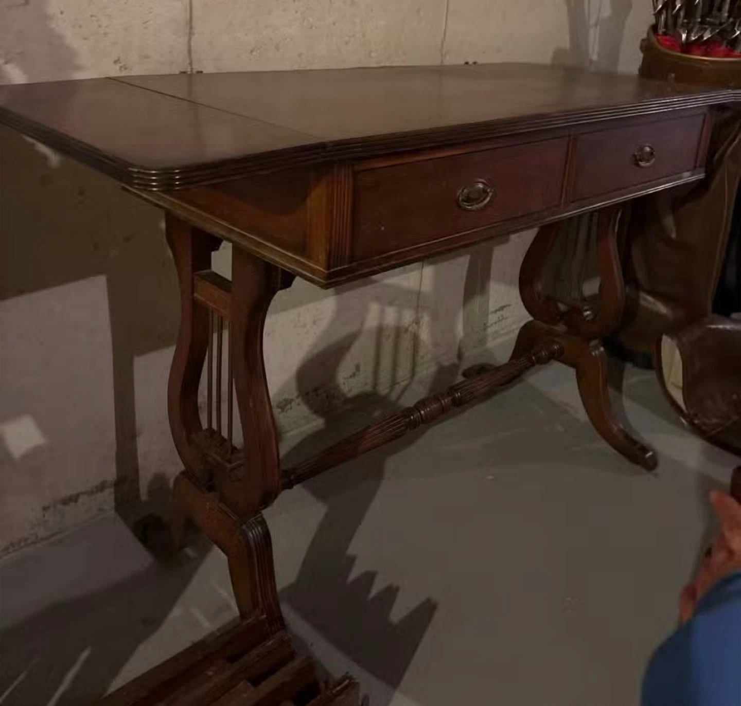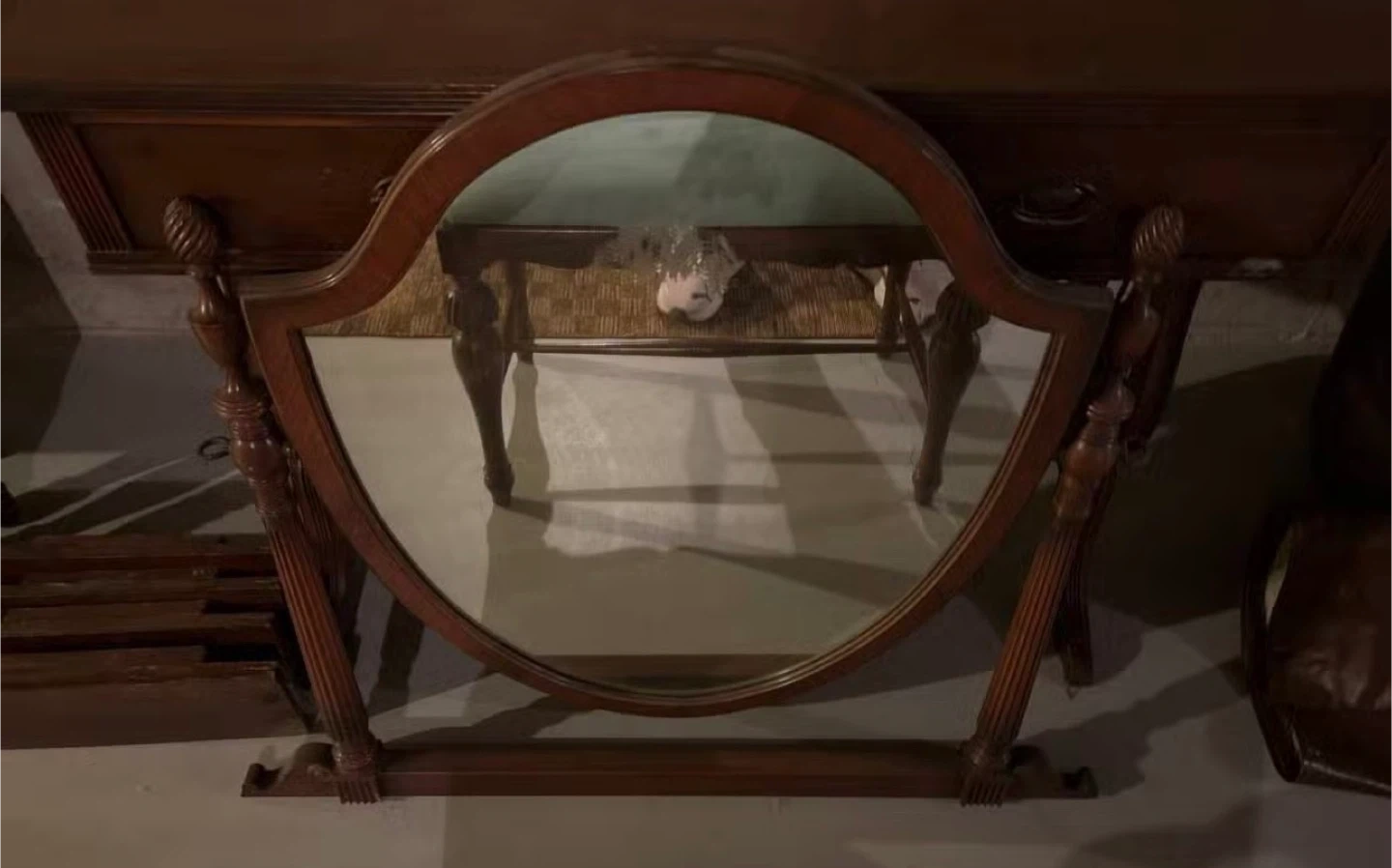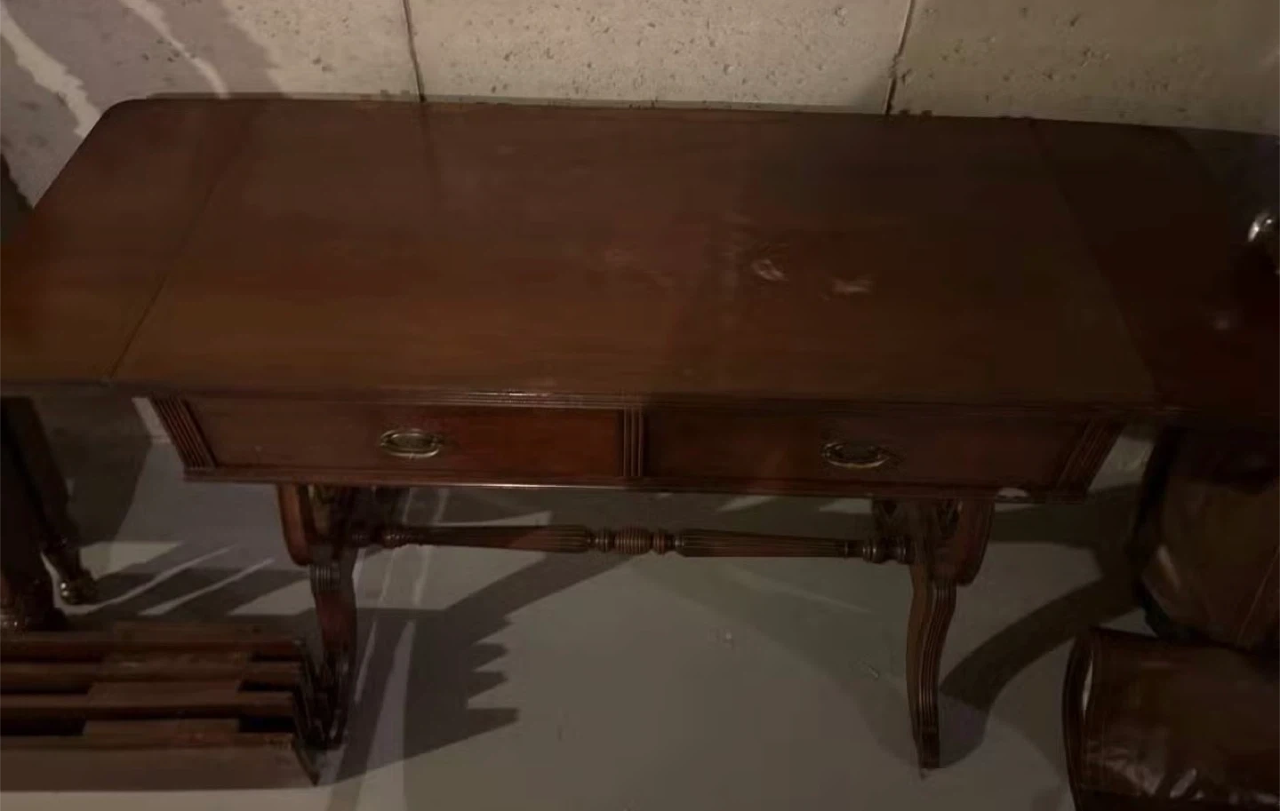 Dark wood drop-leaf vanity table with 2 drawers and matching mirror (detached). Bench with green fabric seat. Bring appropriate vehicle. Located in basement.