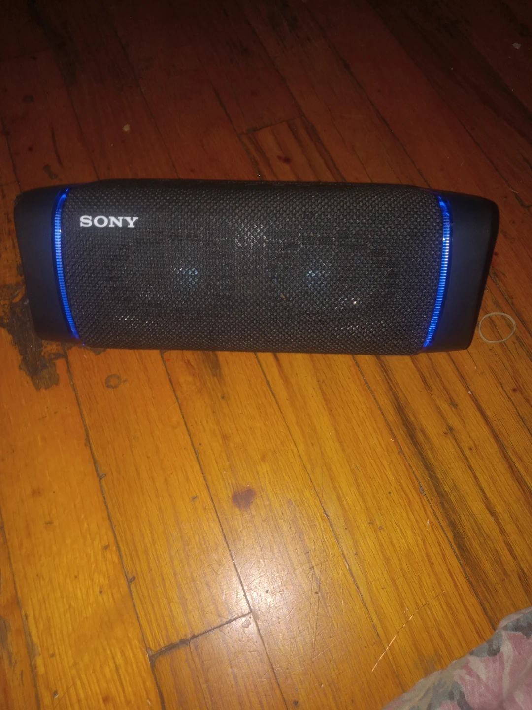 This is a Sony SRS-XB33 portable Bluetooth speaker. It's black with blue LED accent lighting. It features Extra Bass sound technology for deep lows. Water and dustproof design.