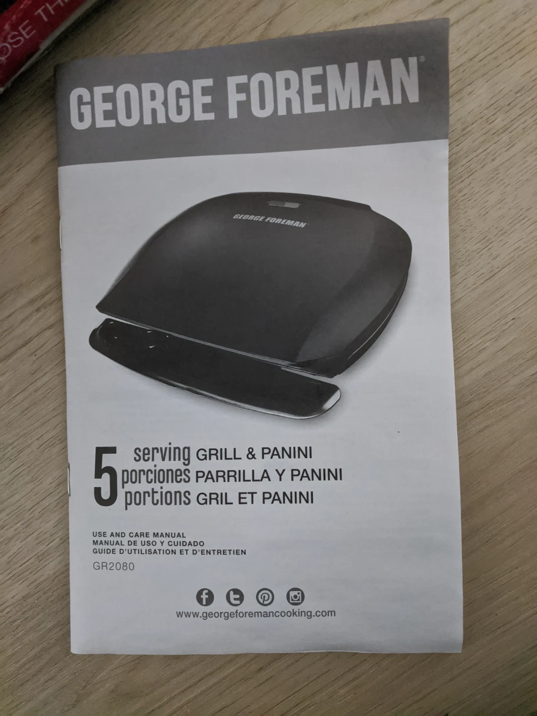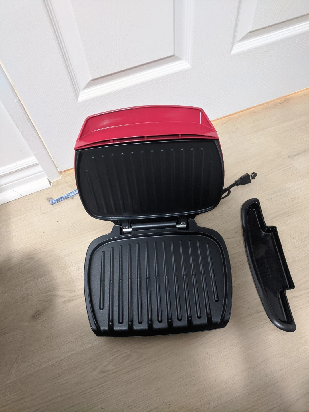 This is a George Foreman 5-serving grill and panini press. It features a non-stick George Tough coating for easy cleanup. It's red and comes with the instruction manual. Pick up at 195 Merton Street Toronto or pick up at subway station Davisvill. And I can deliver it to your house but you need to pay me another $3. Thanks.
