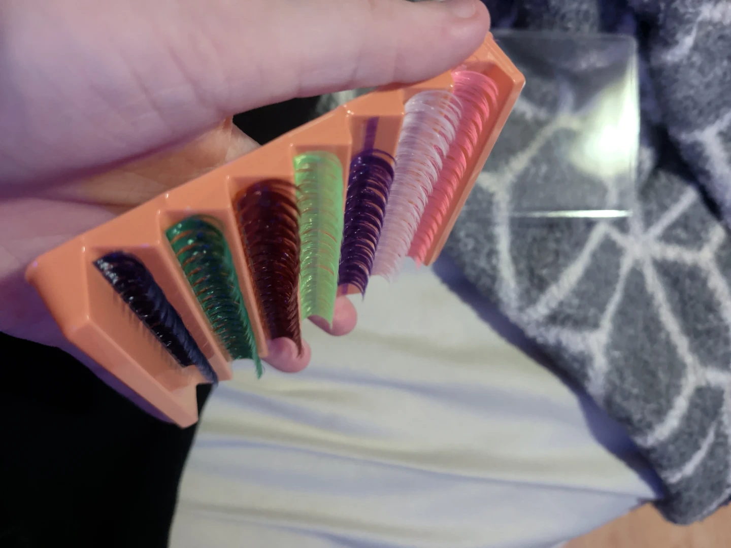 This tray includes multiple rows of assorted colour false eyelashes. They come in a convenient orange case for easy storage and selection. Colours include black, dark green, brown, light green, purple, white, and pink.