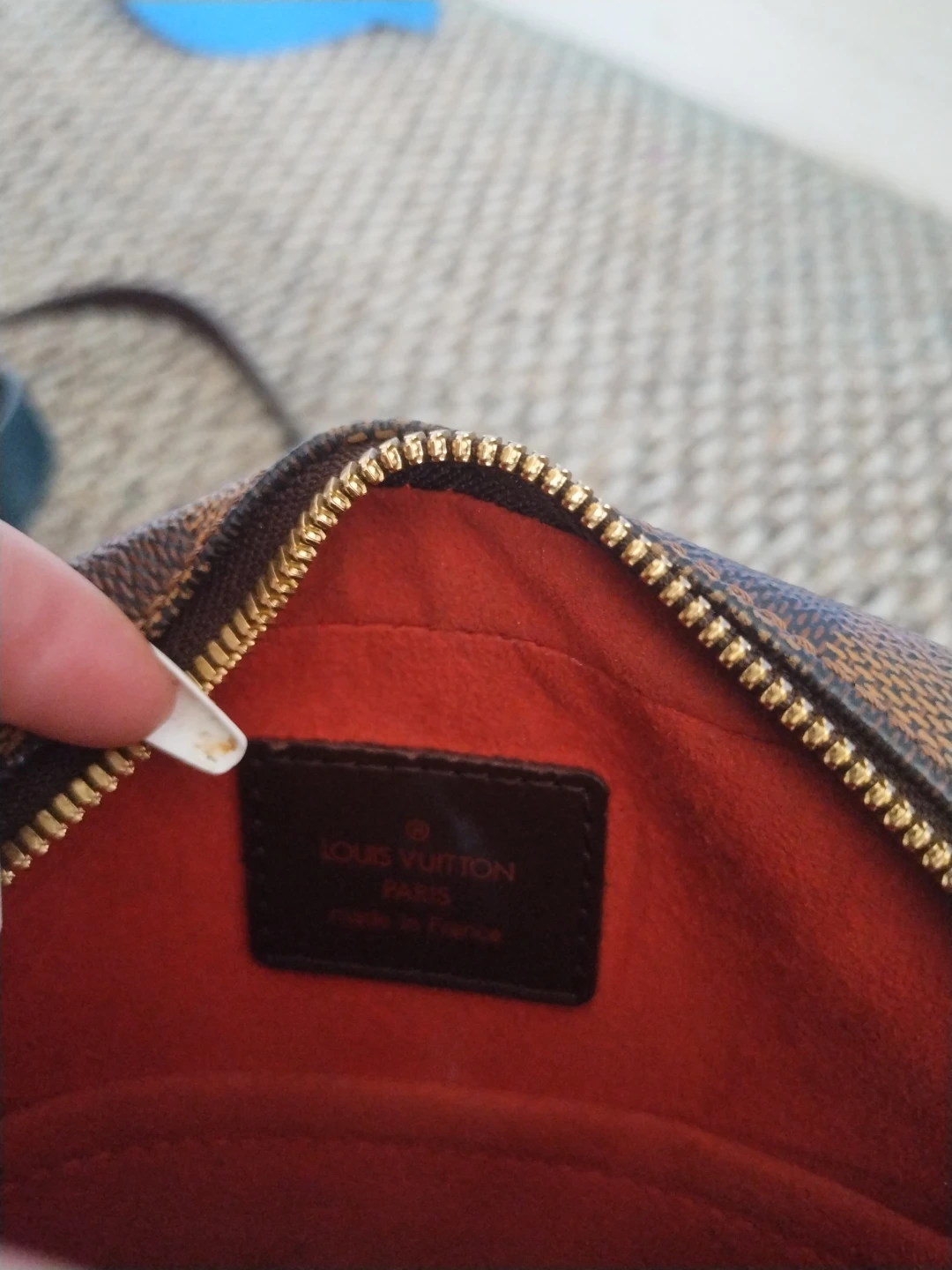 Brown Louis Vuitton crossbody bag in Damier Ebene canvas. Features a zip closure and an adjustable strap. Made in France.