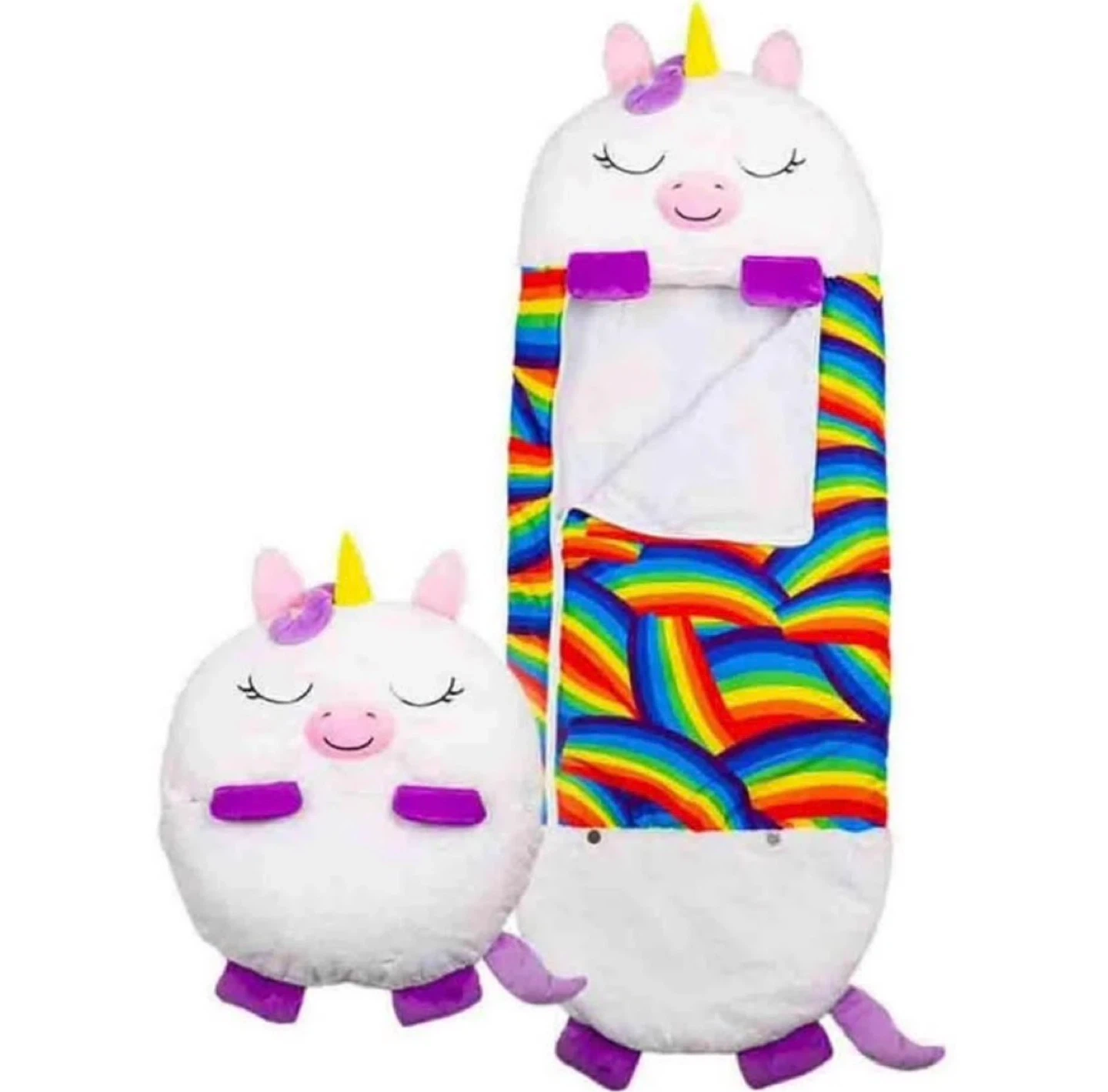 This is a cute unicorn sleeping bag with a rainbow design. It includes a matching plush unicorn toy that the sleeping bag can store inside. Perfect for sleepovers or travel!