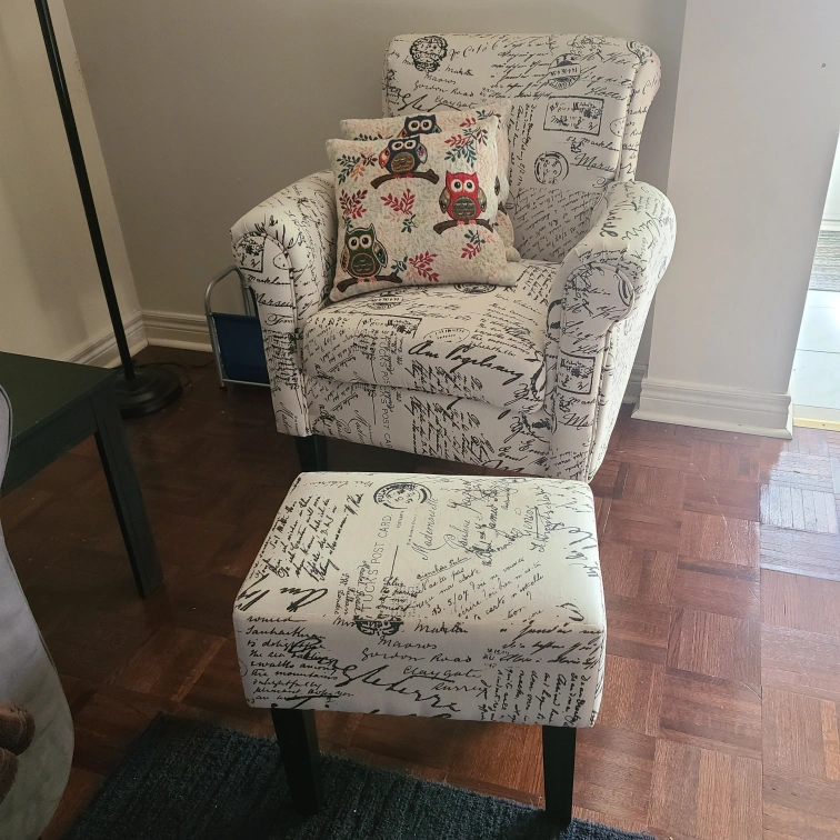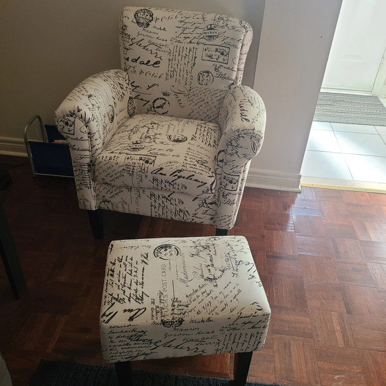 A comfortable armchair with an ottoman. The chair and ottoman have a white and black script fabric cover. The legs need fixing other than that in great condition.