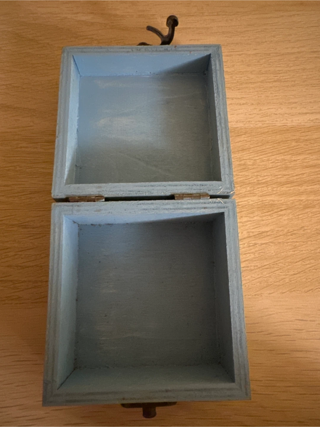 Cute wooden trinket box with a charming hand-painted mushroom design. It's painted a lovely sky blue and features a metal clasp closure. This small box is perfect for storing little treasures!
