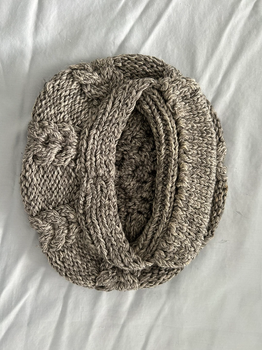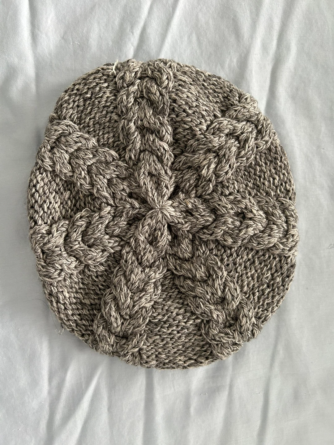 Selling a cozy, hand-knitted beret! It's in a neutral colour, perfect for adding a touch of warmth and style to any outfit. The intricate knit pattern gives it a unique, handcrafted feel