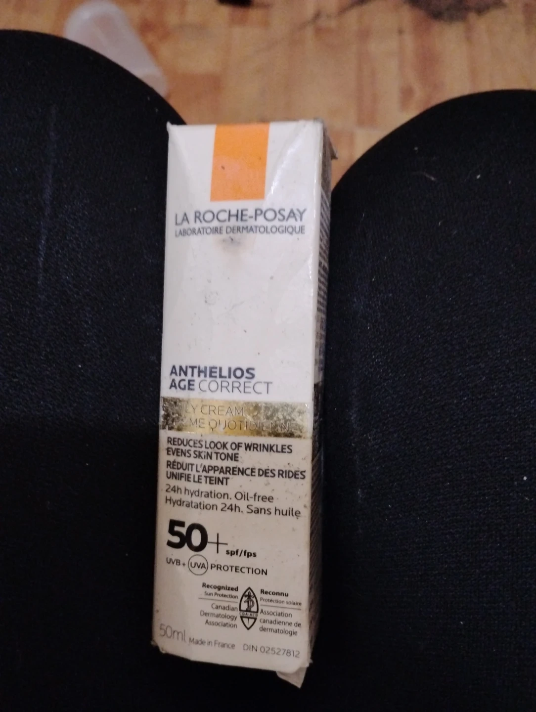 La Roche-Posay Anthelios Age Correct Daily Cream with SPF 50+ protection. It's a daily cream that reduces the look of wrinkles and evens skin tone. 24h hydration, oil-free. 50ml bottle made in France.