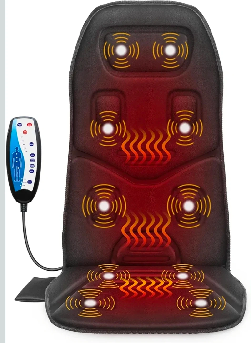 Brand New. This Comfier GF-2206 massage seat cushion has 10 powerful vibration motors and a heating function. It's made of black fabric and includes a controller and power adapter. Dimensions are 17.7 inches wide by 27.5 inches tall.