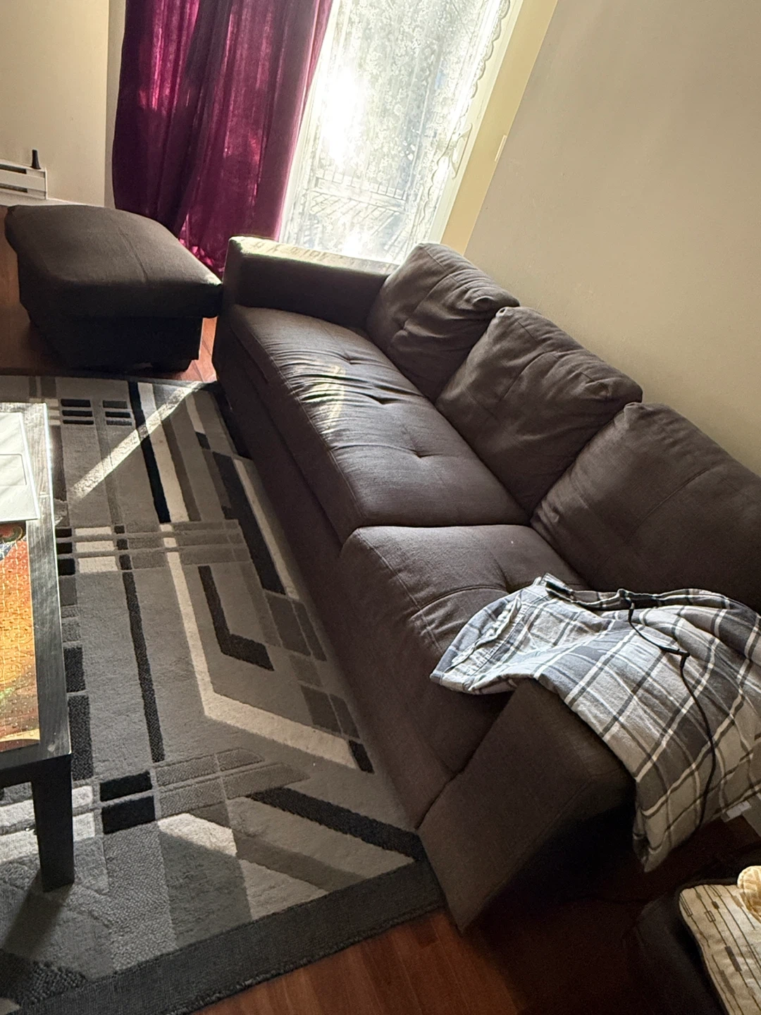 Selling a comfy brown sofa with a matching ottoman! It's a great set for relaxing in your living room. The sofa is in good used condition. Perfect for lounging and movie nights. Can be changed “L” shape sectional sofa with ottoman