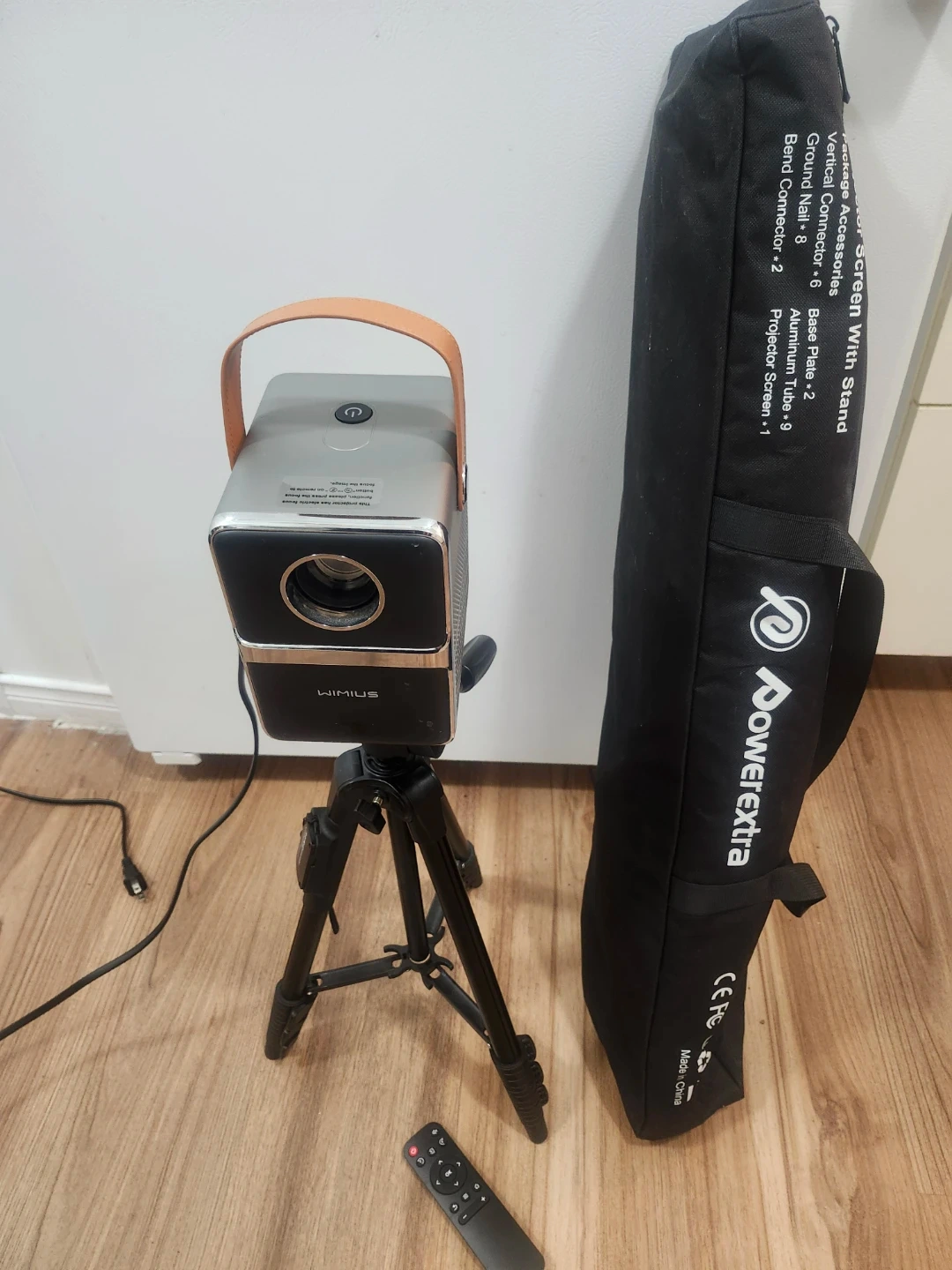 This WIMIUS portable projector comes with a projector screen and stand for easy setup. Perfect for movie nights anywhere!