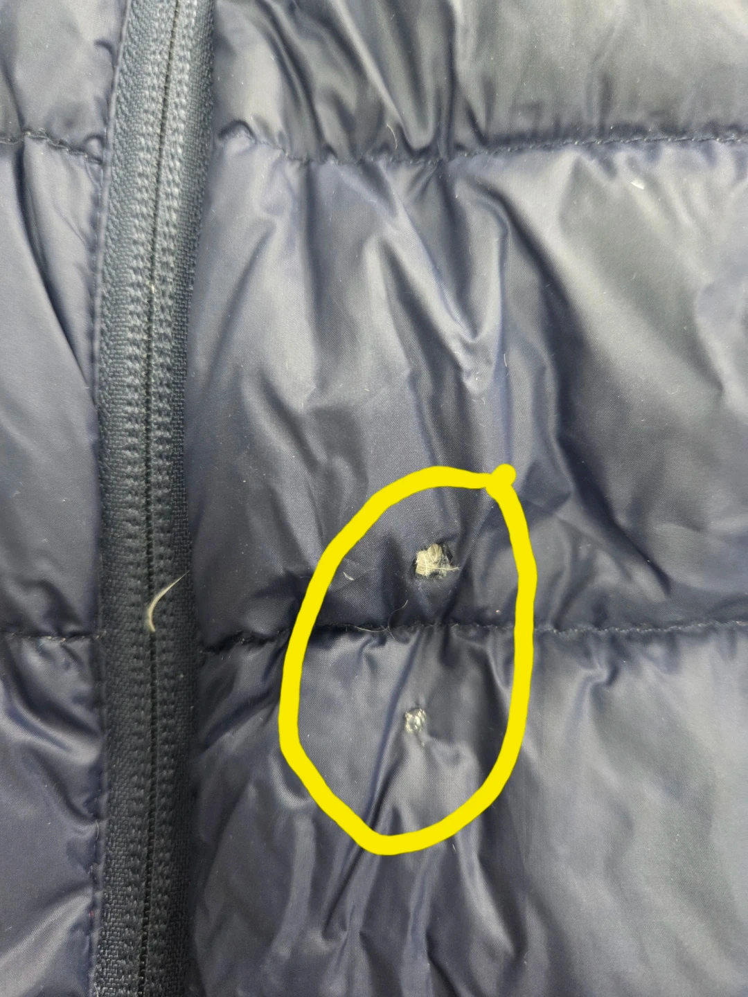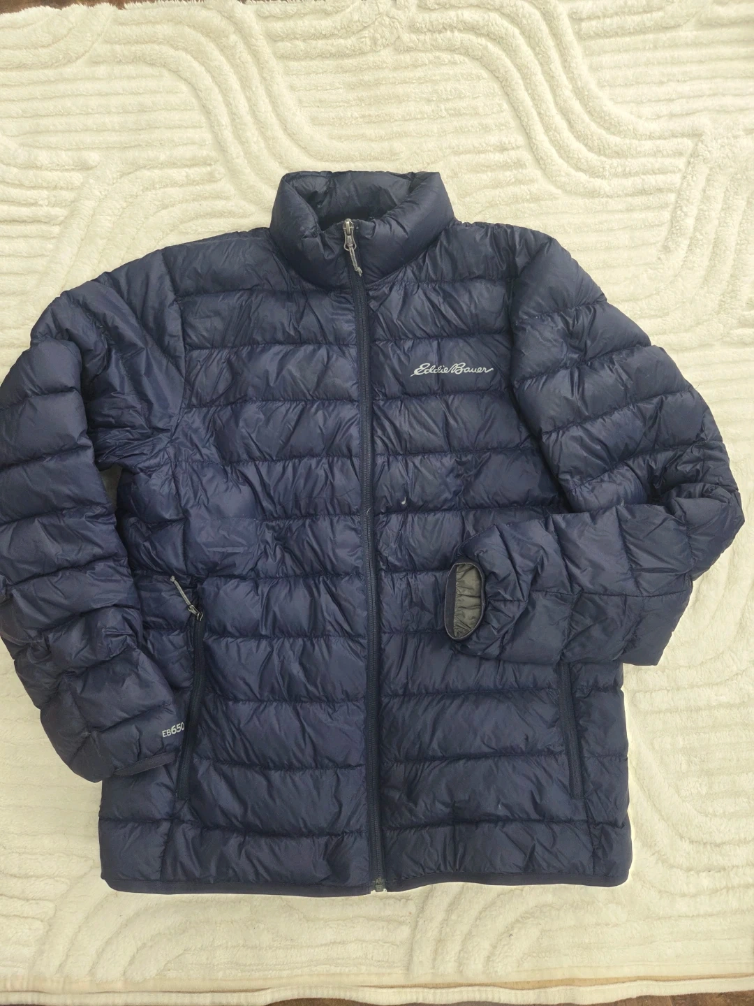 Eddie Bauer navy blue down puffer jacket. It's a great warm layer for colder days. There are a couple of small marks on the front where one is a small hole.