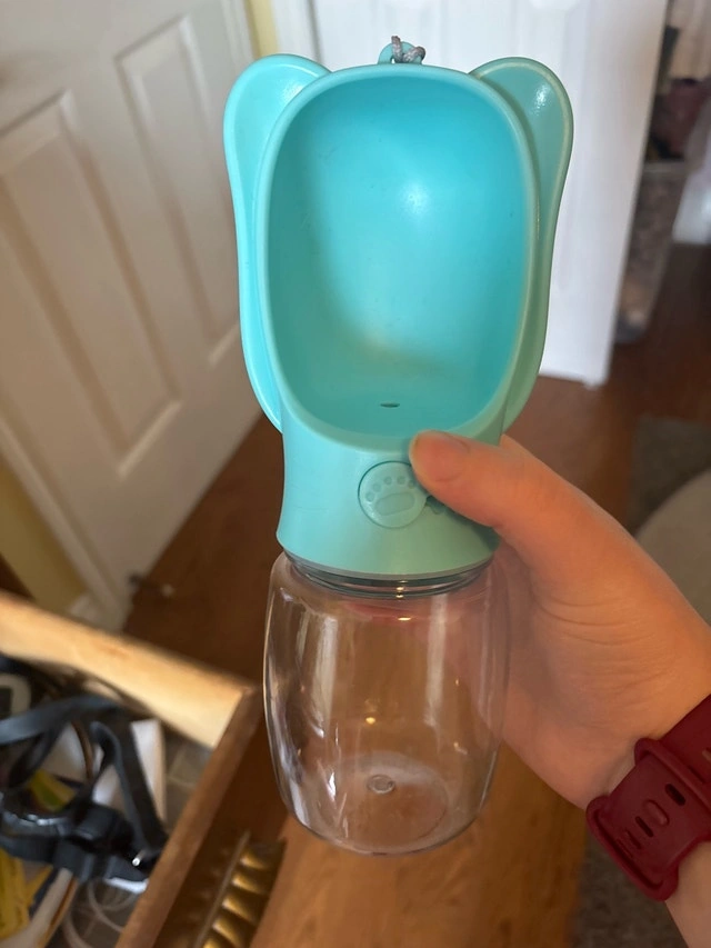 Keep your furry friend hydrated on the go with this portable dog water bottle. This used bottle is designed with a convenient, one-hand operation, making it easy to dispense water into the attached bowl for your dog to drink. Perfect for walks, hikes, and travel, it ensures your pet stays refreshed wherever you are. Cash accepted.