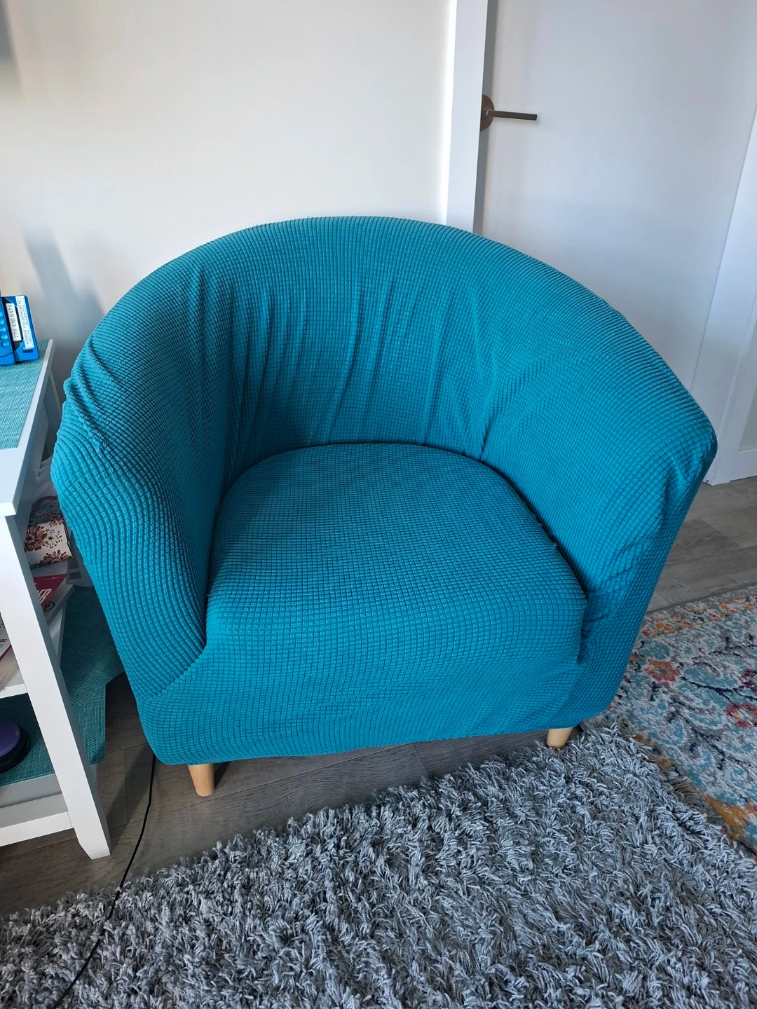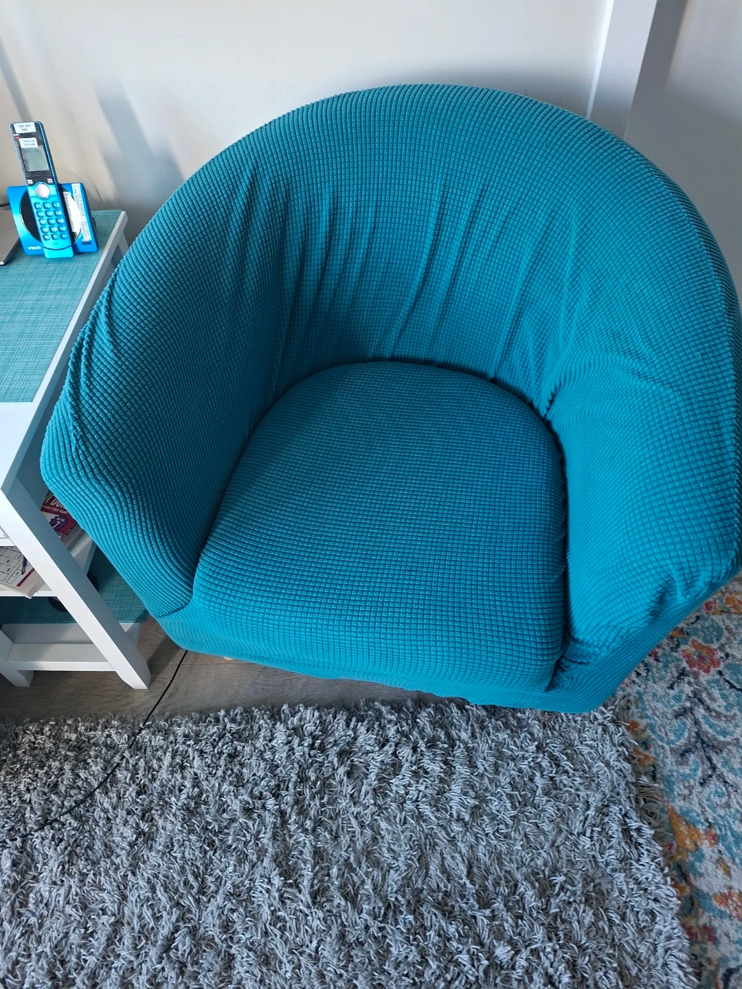 Comfy armchair with a removable teal stretch cover. The chair itself is a neutral cream colour. It's a great way to update your living space or protect your furniture! Measures approximately 30" wide, 32" deep, and 31" high.