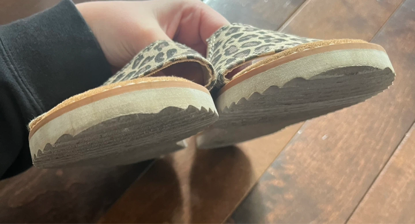 Women's size 7.5 leopard print sandals with elastic straps. Features memory foam insoles for added comfort.
