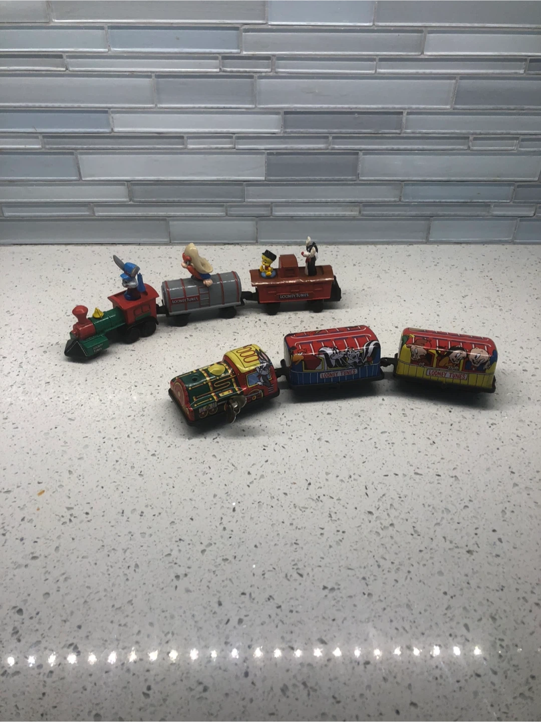 This is a vintage Looney Tunes tin wind-up train set. It features classic characters from the cartoon. The train cars are connected and appear to be made of tin. Dye cast looney tunes train in great shape