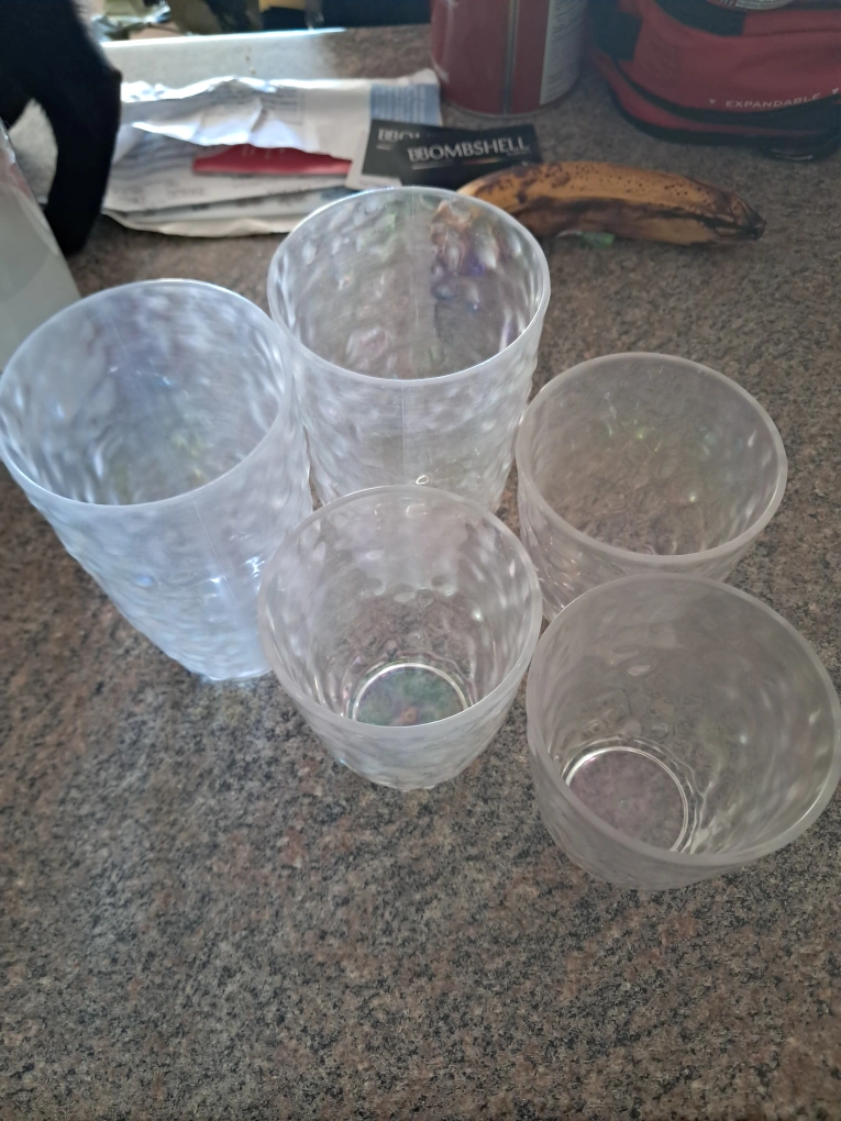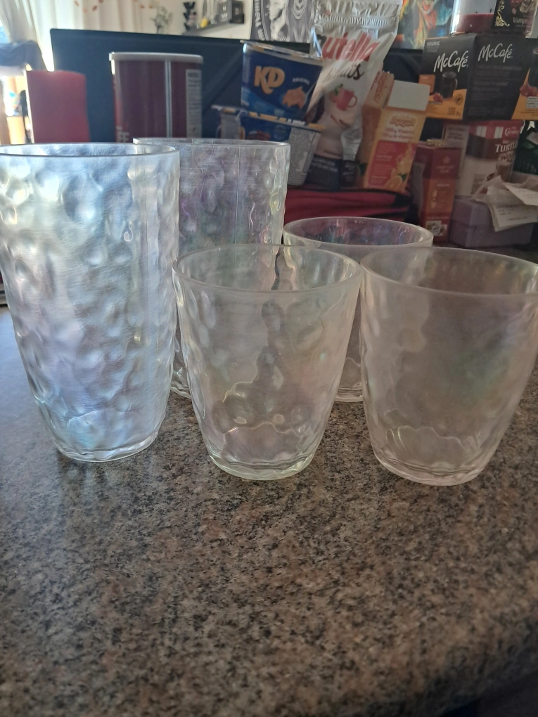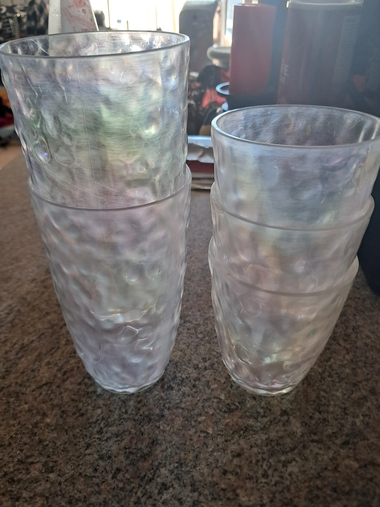 70Selling a set of five drinking glasses with a unique hammered texture. These glasses have a beautiful iridescent finish that catches the light. They come in two sizes, perfect for different drinks. They're in great condition and ready to add a touch of elegance to your table!