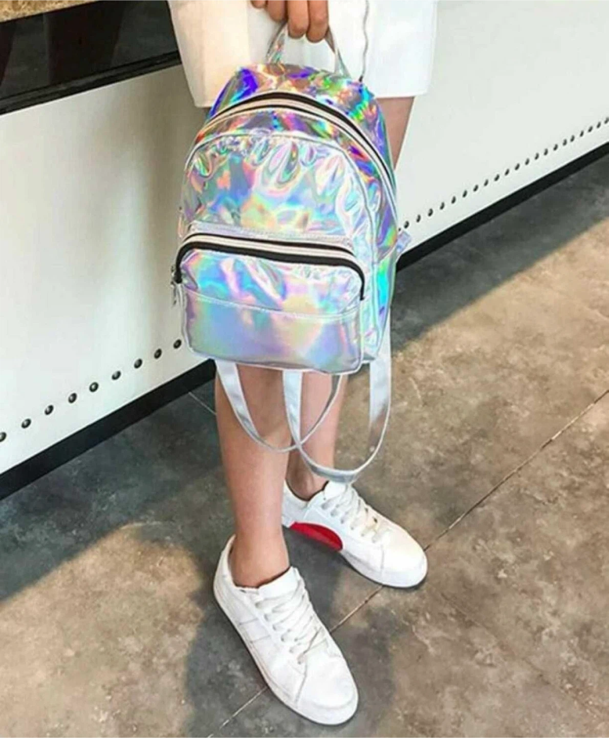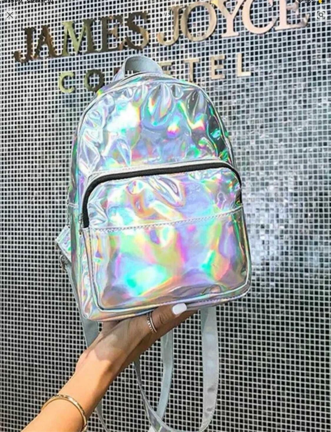 New iridescent holographic backpack! It's a real eye-catcher with its shiny, colour-shifting material. Perfect for adding a bit of sparkle to your everyday look or for special occasions