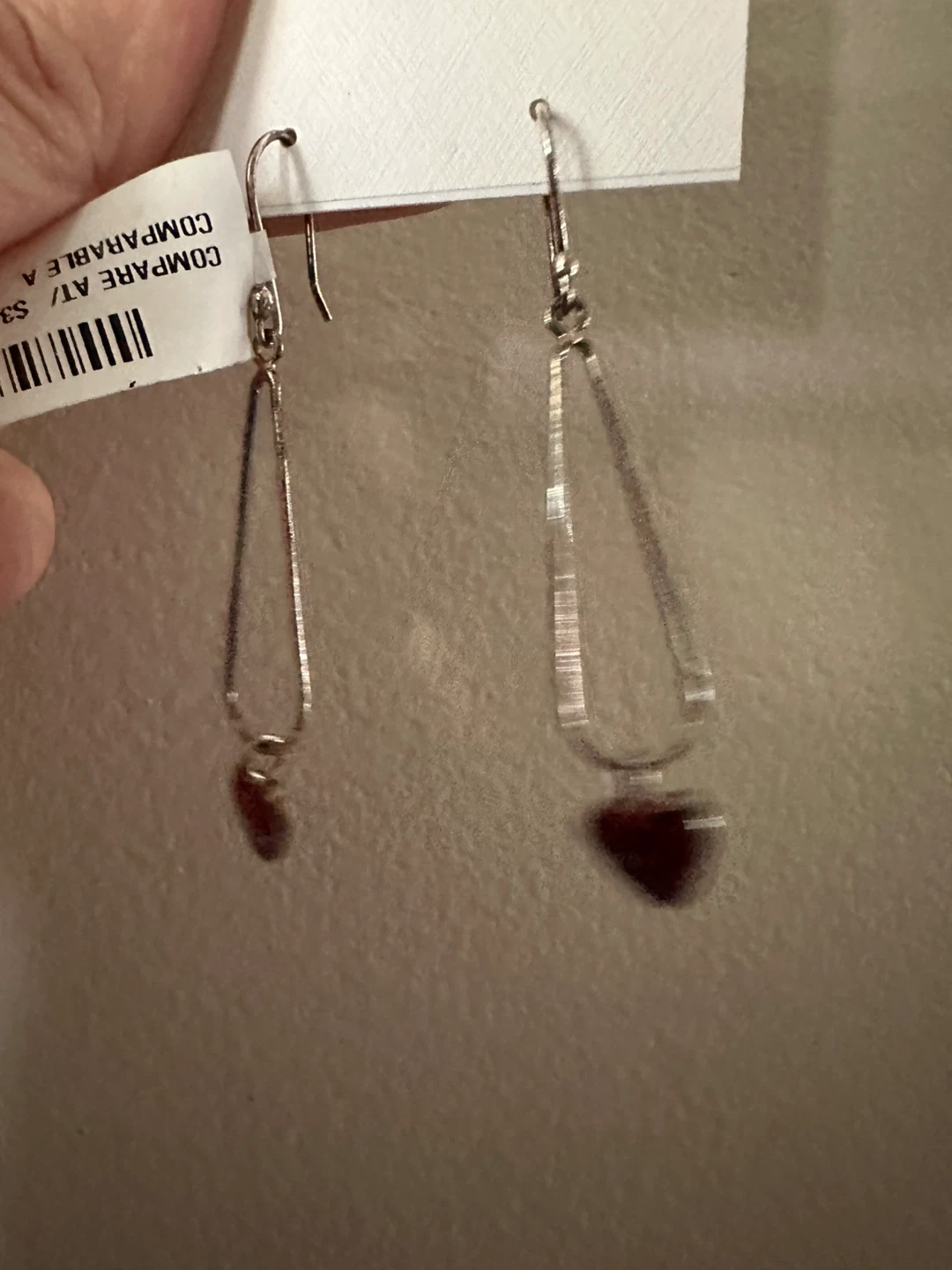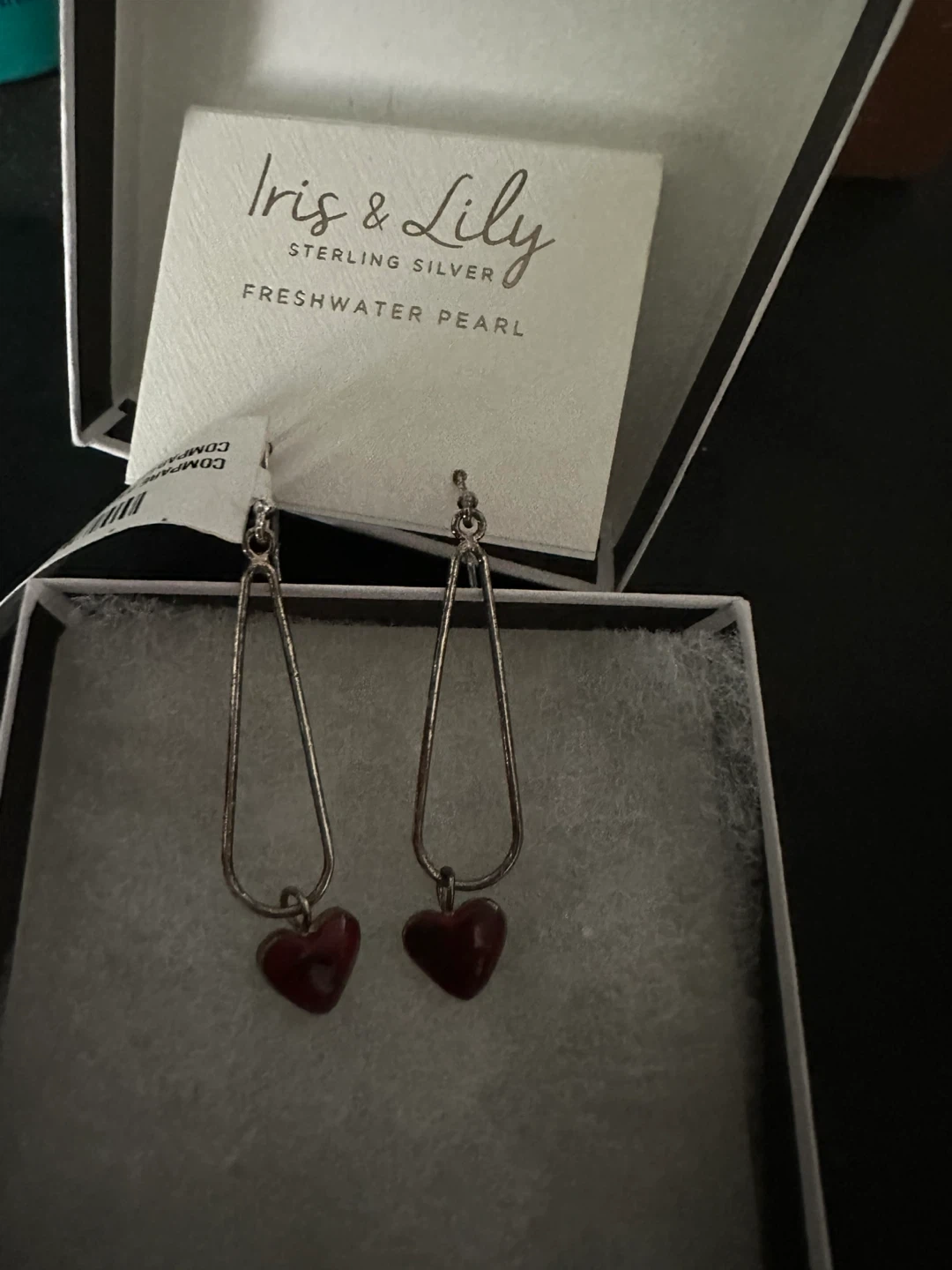 These Iris & Lily earrings are sterling silver with freshwater pearls. The earrings have a heart-shaped pearl at the bottom of a silver drop.
