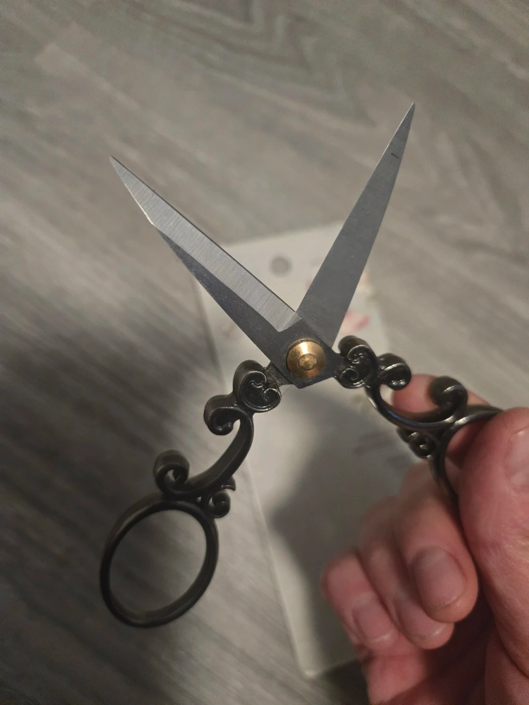 These scissors feature a European classic style with novel design and exquisite decoration. They have a sharp edge for easy use. Crafted from metal with ornate handles. Super sharp. Good for haircuts