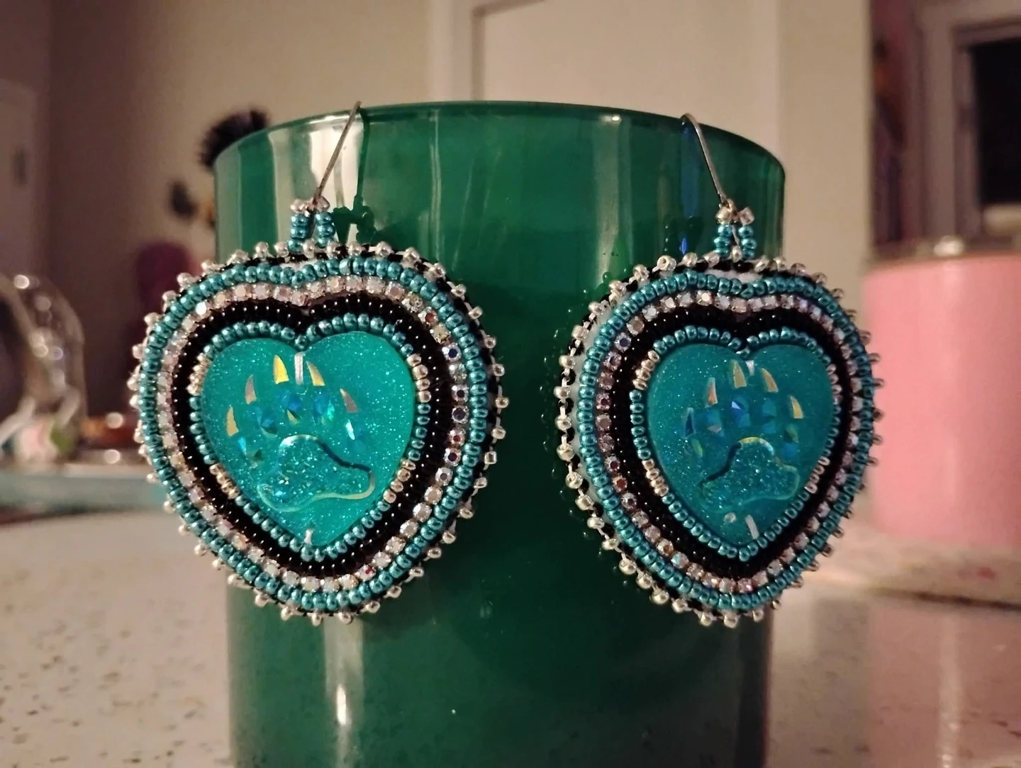 Handmade beaded heart earrings by myself in a vibrant teal colour. They feature a sparkly paw print design and dangle from fishhook ear wires. These unique earrings are perfect for adding a touch of personality to any outfit!