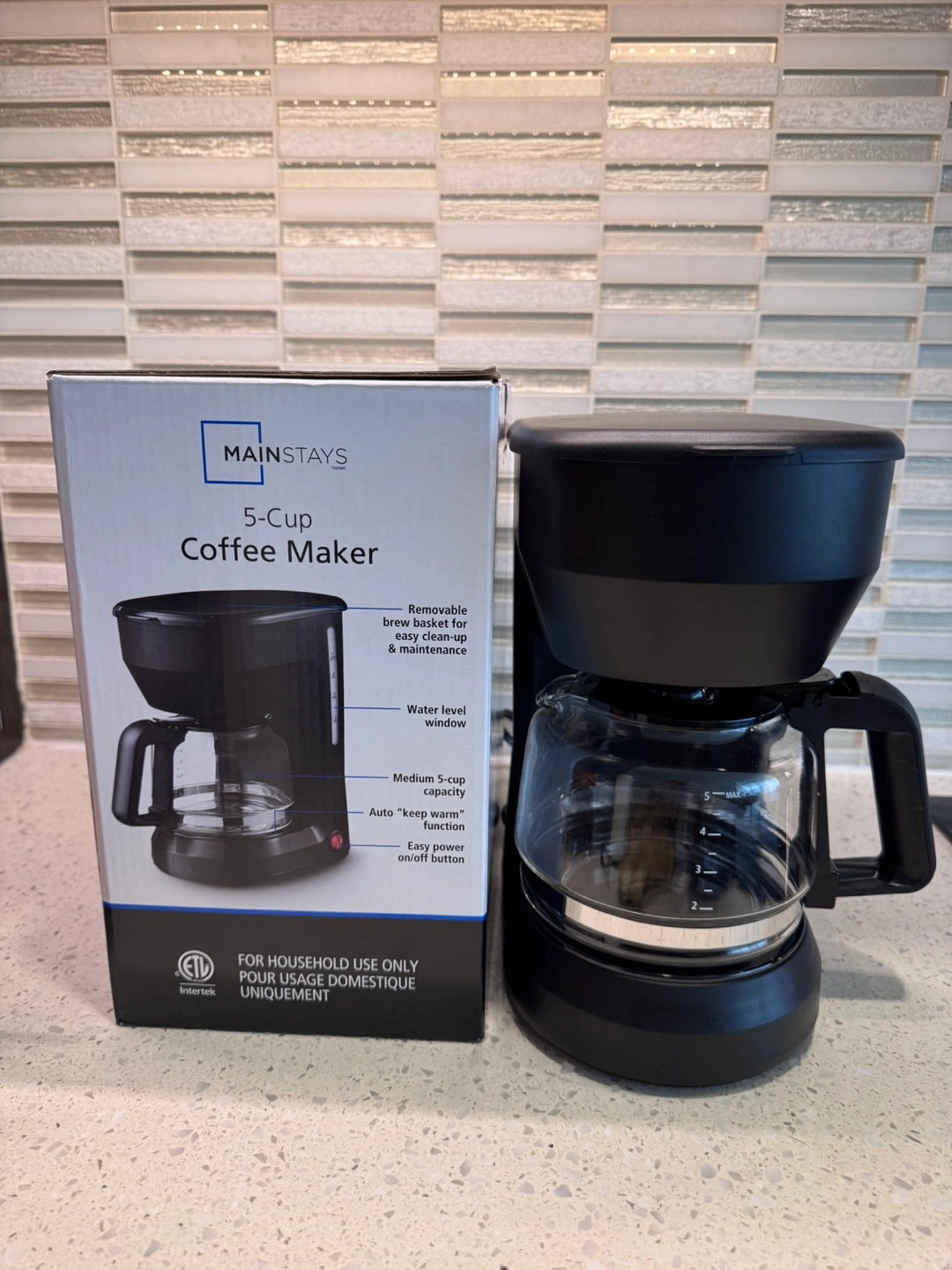 Selling a Mainstays 5-Cup Coffee Maker in excellent condition! It comes with a removable brew basket for easy cleaning and maintenance, plus a water level window. It also has a medium 5-cup capacity and an auto "keep warm" function. Easy power on/off button. The box is included!