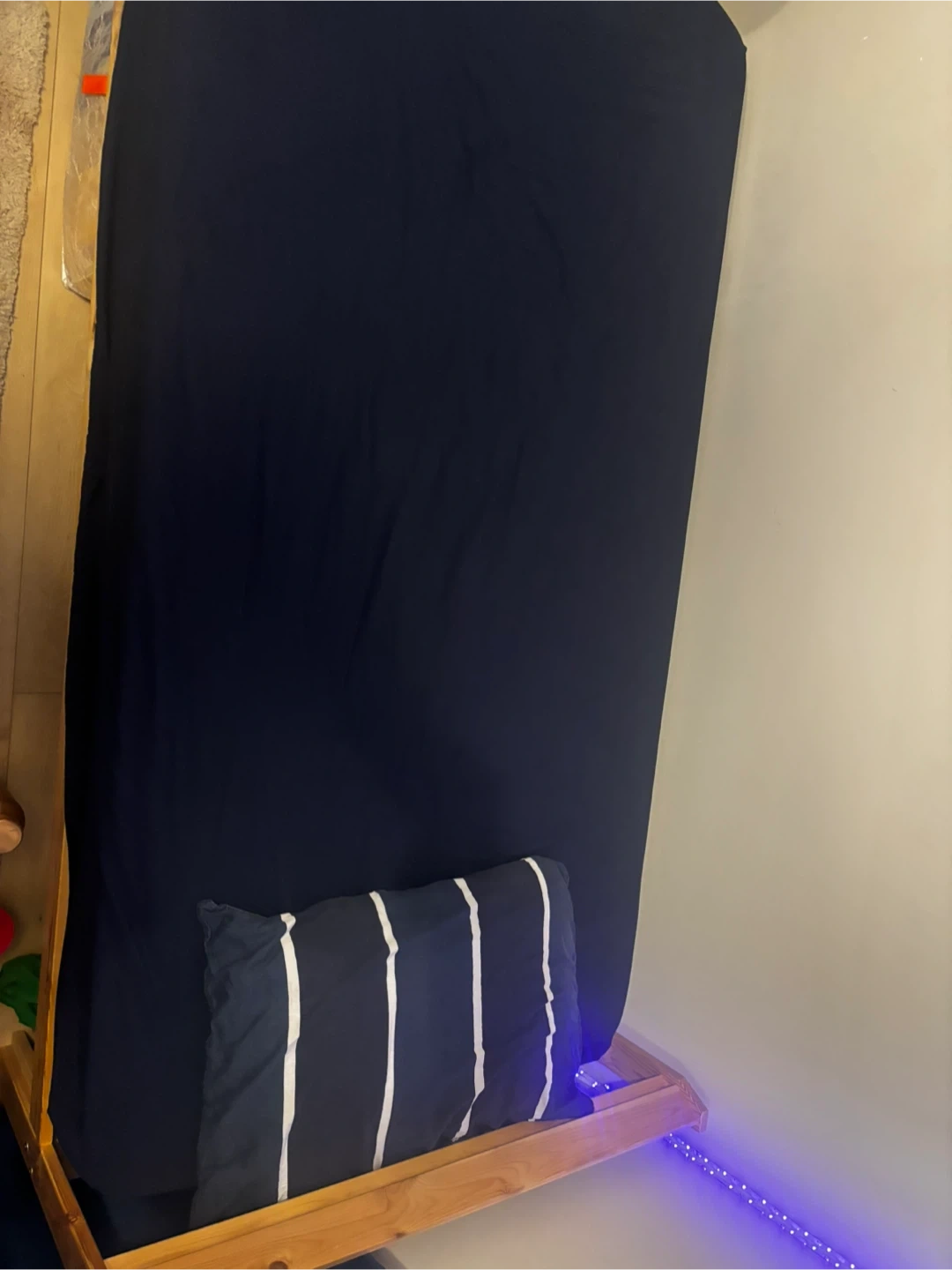 A simple wooden bed frame with a slatted base. It's made of natural wood and includes metal supports for the slats. This bed frame would be suitable for a single mattress. Price will negotiate.